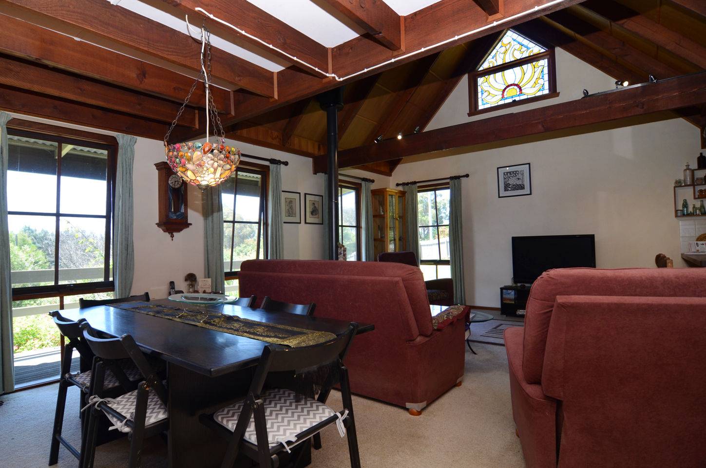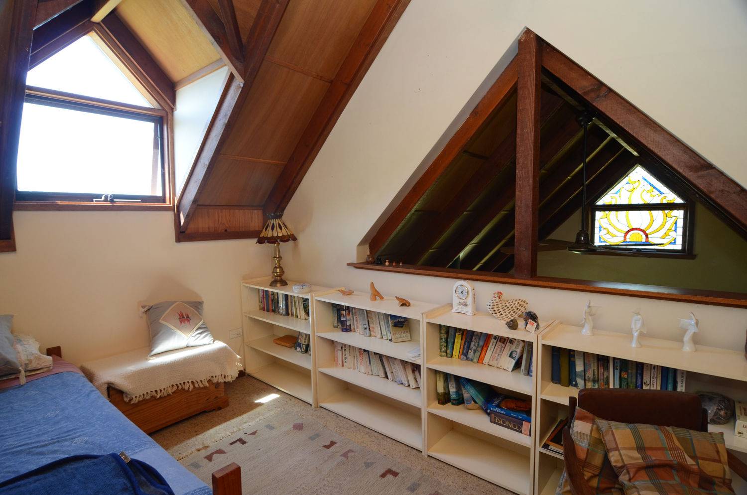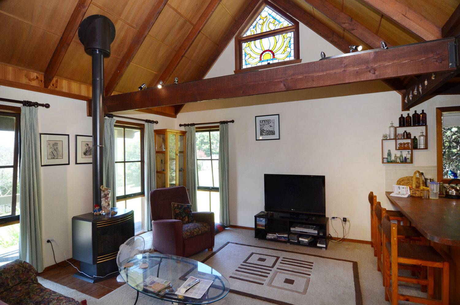 Cathedral ceilings and a beautiful stained glass highlight window enhance the living areas which also features a gas heater and a nice kitchen with walk-in pantry and breakfast bar. Downstairs has two bedrooms with WIR and BIR, bathroom, laundry and a 2nd private deck while upstairs features a generous bedroom with BIR and a study overlooking the lounge.