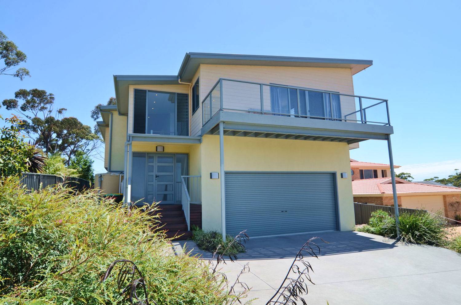 The entrance foyer makes a great first impression with very high ceiling, louvred highlight windows and a timber staircase enticing you up to the cavernous living space above. Featuring cathedral ceilings, timber flooring and strategically placed 'smart' windows, the open plan living and dining space draws you through to a full width entertainment deck that looks out to Bournda Island and the ocean horizon. The Masterchef of the family will love the stylish kitchen with its excellent bench space, great storage and quality stainless steel appliances including dishwasher and gas cooktop.