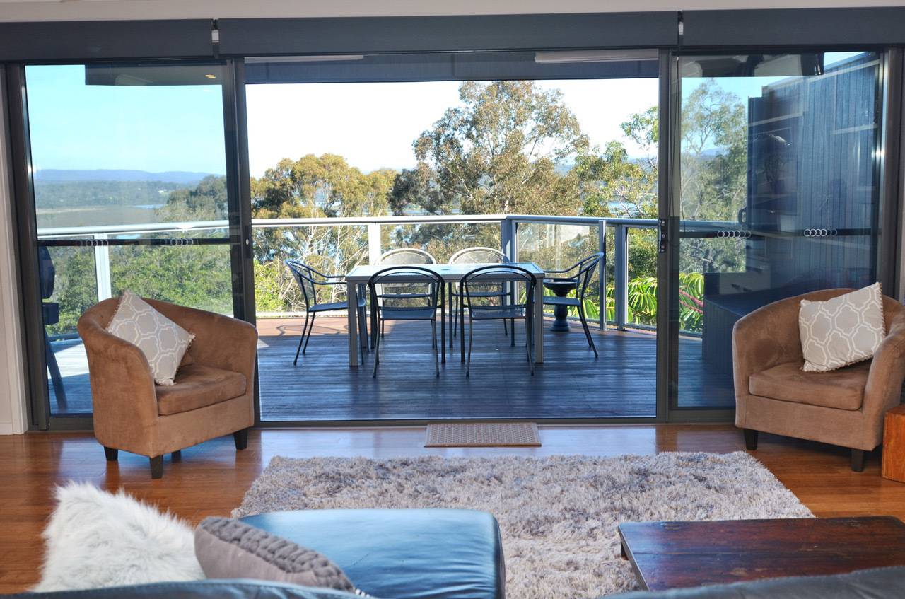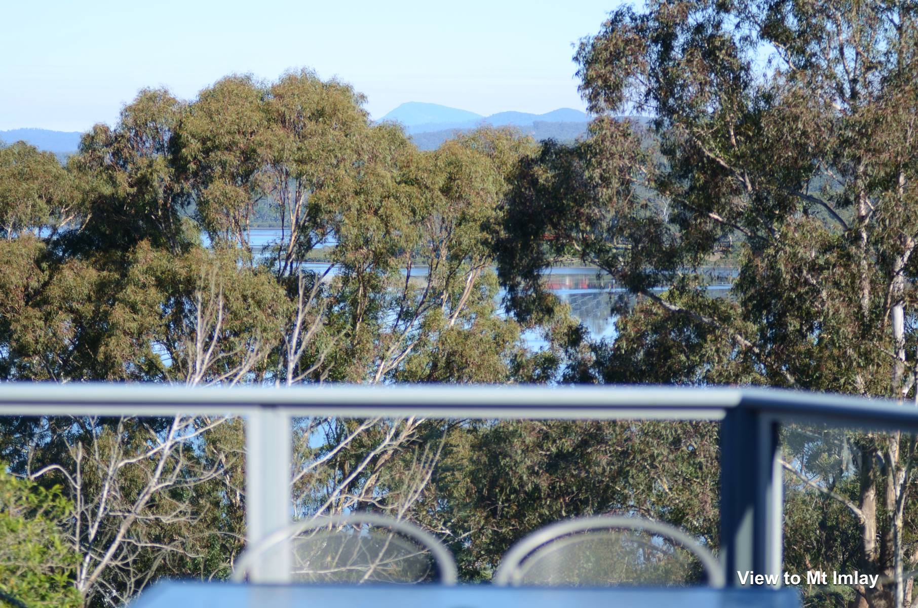 Level entry, open plan living walking into the upper floor comprising a chic modern kitchen with function and storage a feature. Adjoining is the living/dining area that includes clever built in storage looking onto a huge deck that serves as another living area with retractable awning and privacy screens while taking in the mountain backdrop, blue waters of Merimbula Lake and the gorgeous ocean views.