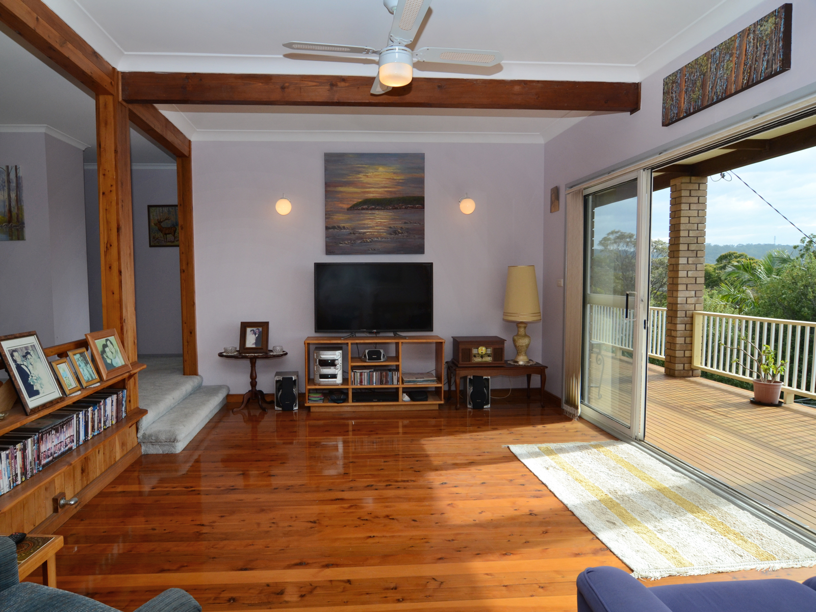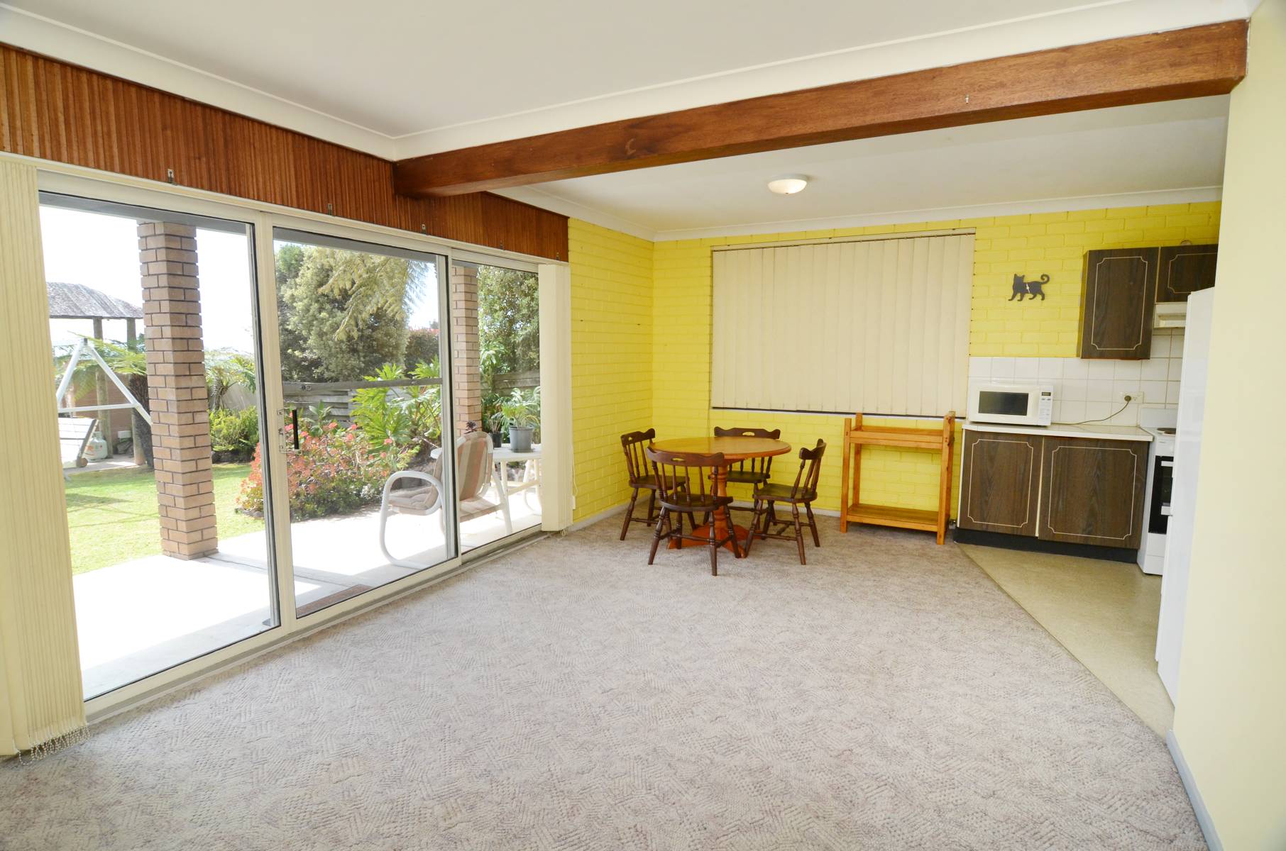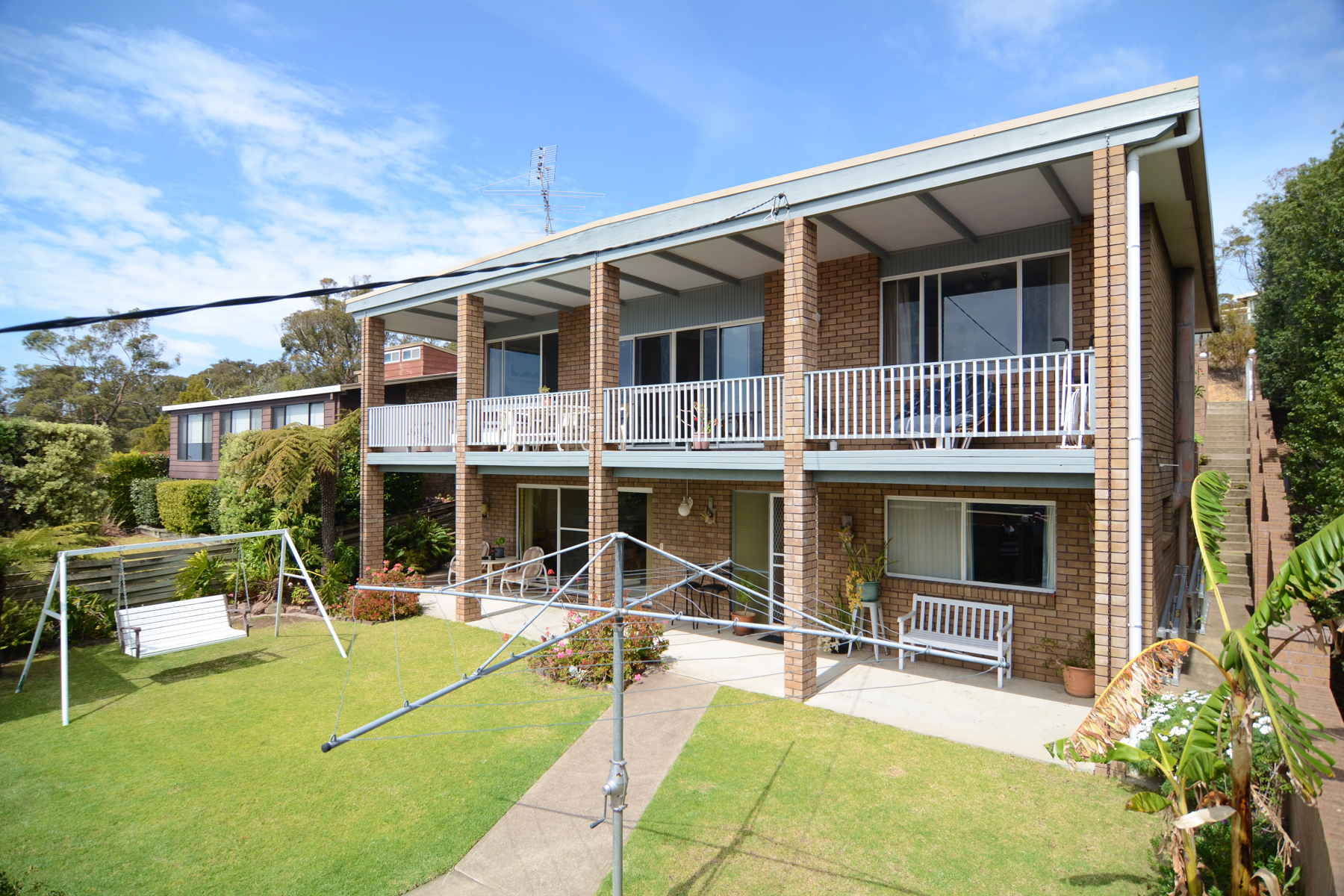 The top floor comprises a timber kitchen flowing into the dining room and sunken living room that soaks up the gorgeous morning sun and offers polished timber flooring. The inviting full length balcony is covered making the perfect place for relaxed conversation while overlooking your pool area, Merimbula township and lake /ocean horizon - the view will amaze. There are three great sized bedrooms with BIR's, ensuite to the master bedroom and a main bathroom with separate bath and shower.