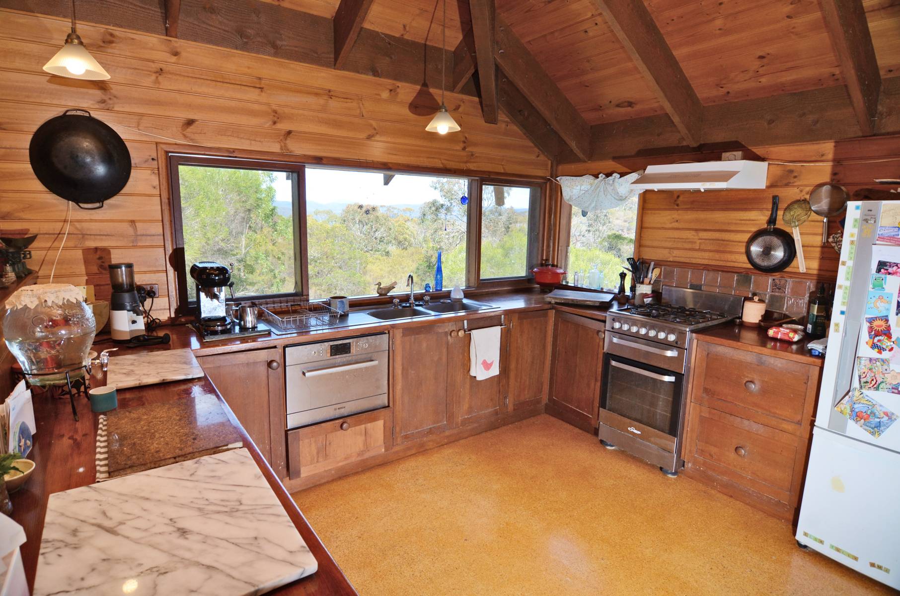 The upper level boasts incredible raked timber ceilings with two spacious living areas. Sit and relax in front of the wood heater in the winter months in the cozy family room or entertain guests in the summer in the large living/dining space that sprawls out on to a fabulous covered entertaining deck. The large kitchen has a walk in pantry, dishwasher and gas cooktop. Downstairs offers 3 super sized bedrooms all generously robed, each with a gorgeous garden outlook! The bathroom and laundry areas are also impressive in size! Sit in your spa bath and relax with the bushy surrounds on view out the window!