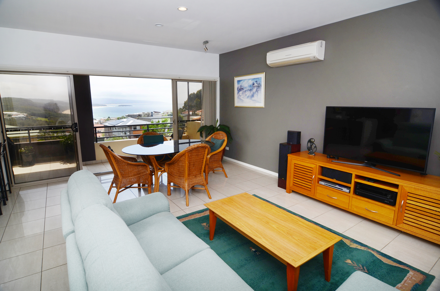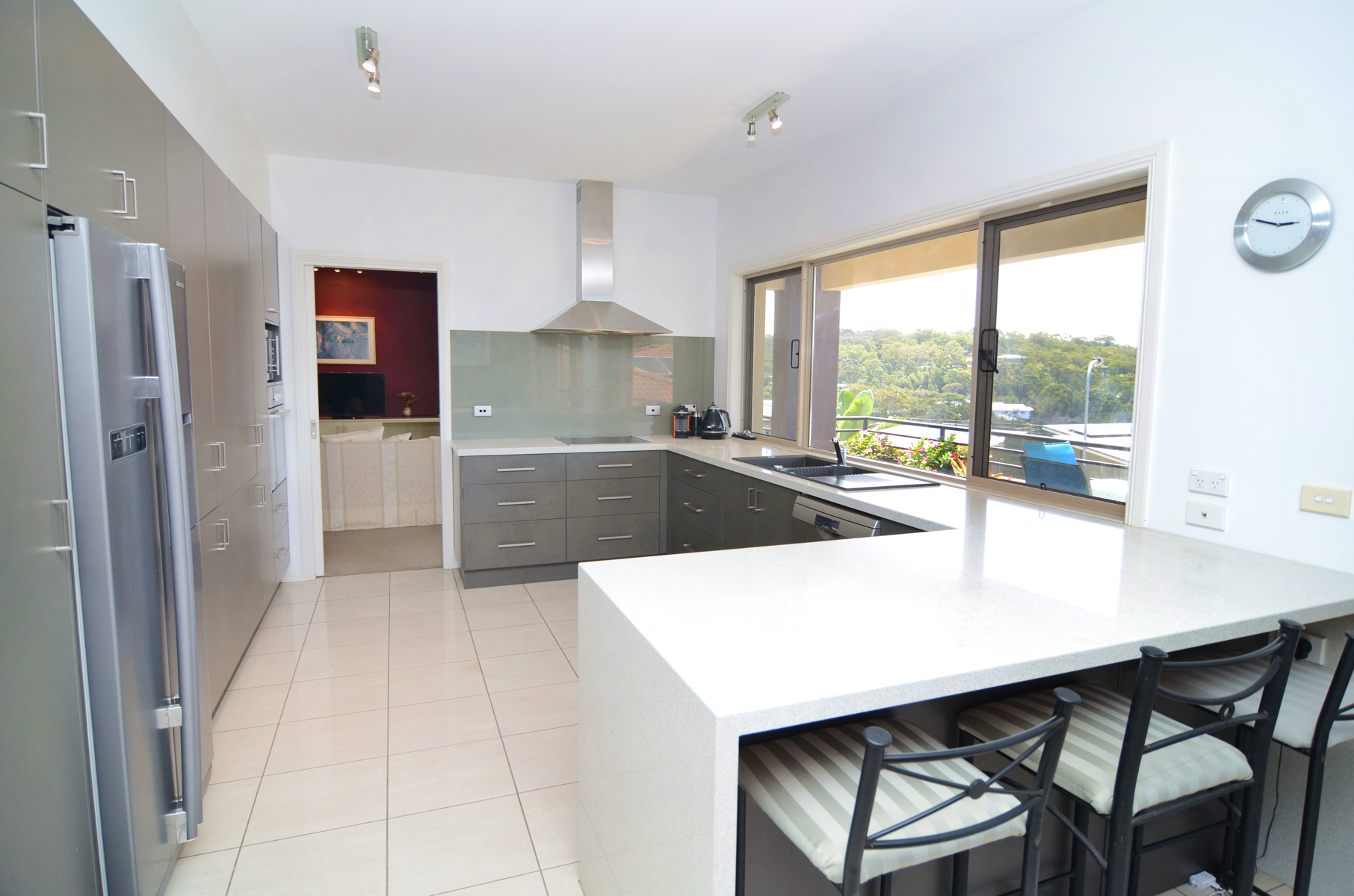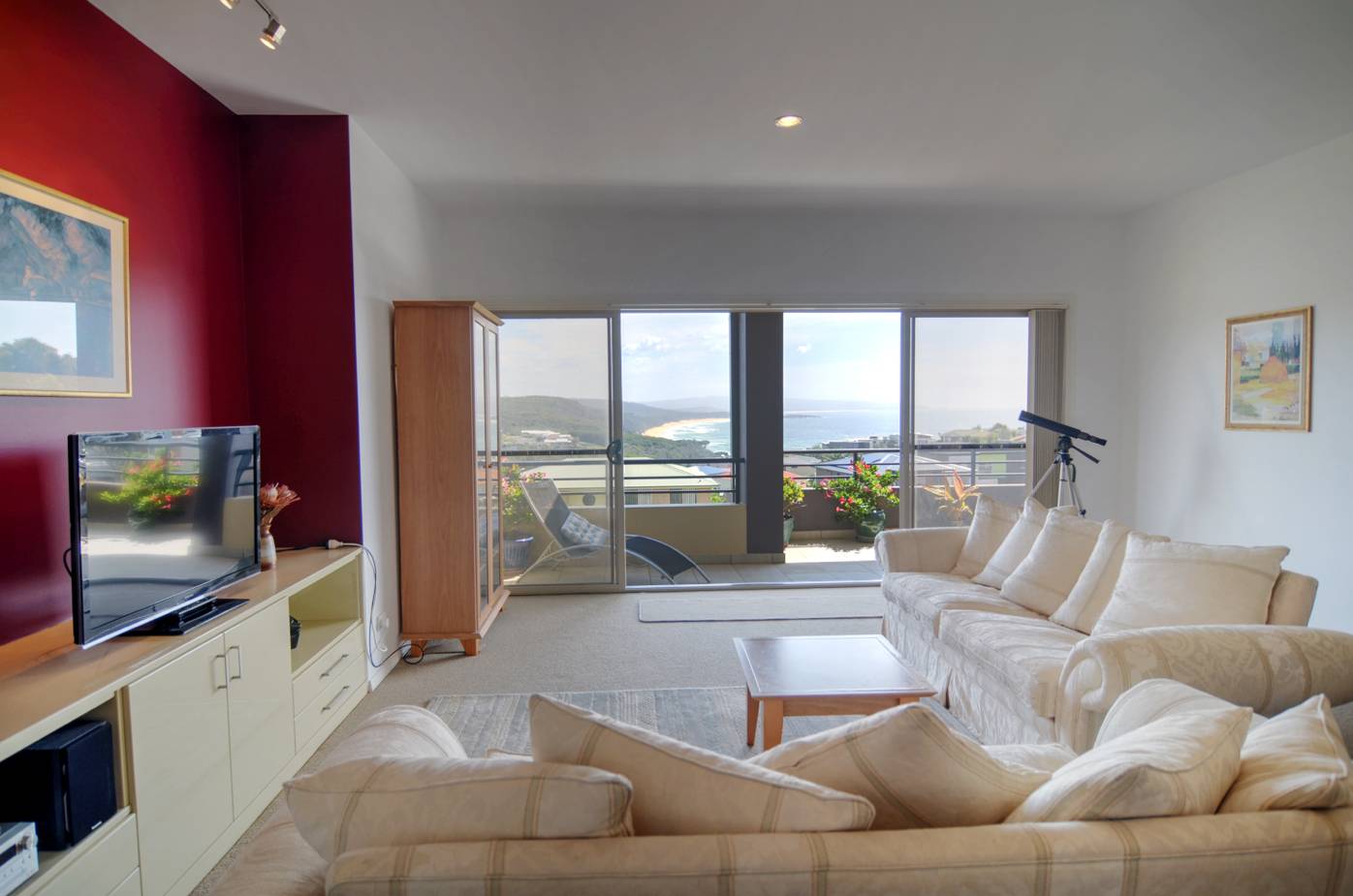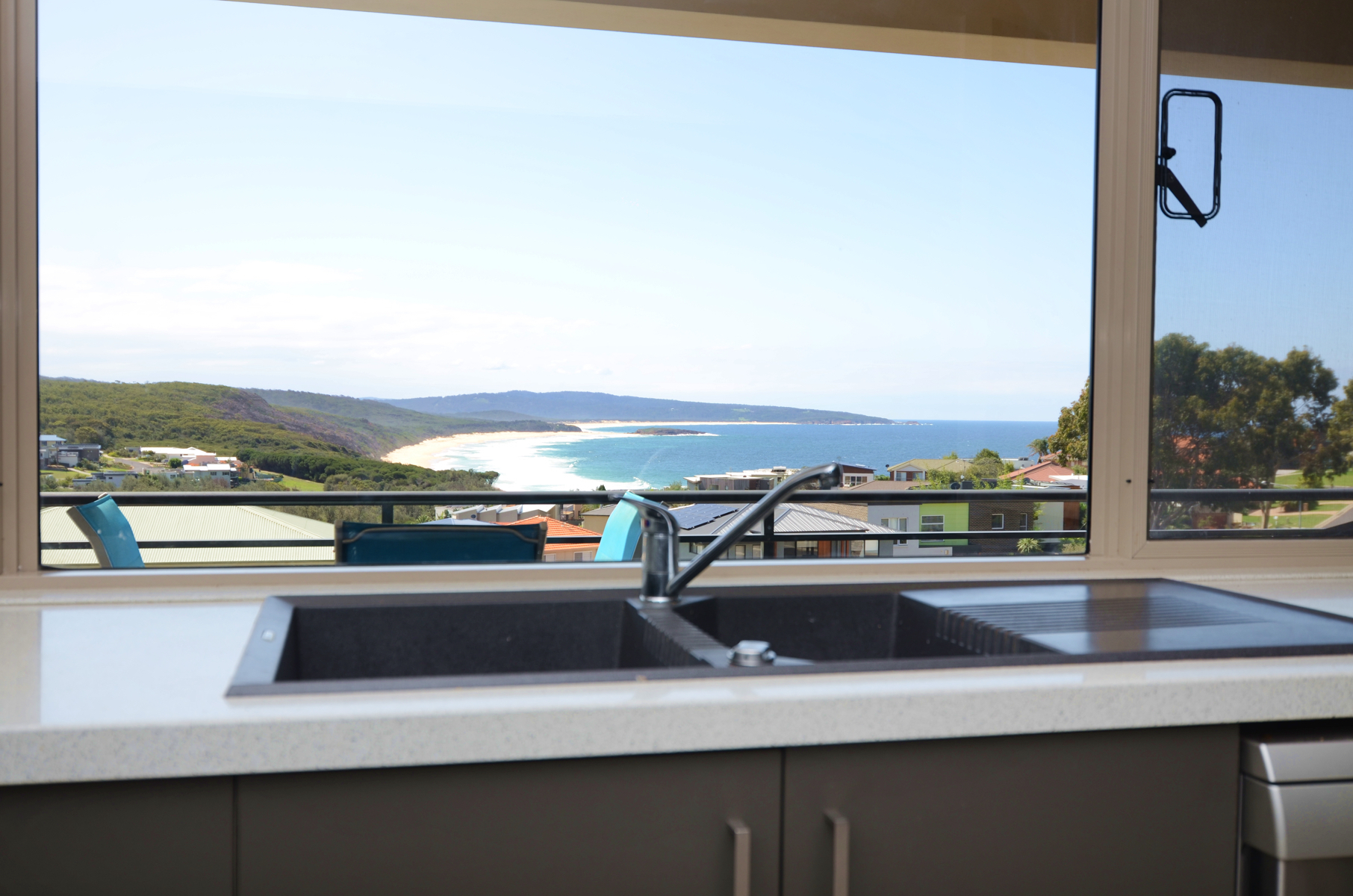 The living areas are separated by a central, modern kitchen overlooking Tura Beach and Bournda National Park with muted stone bench tops, quality appliances and a huge amount of cupboard storage.