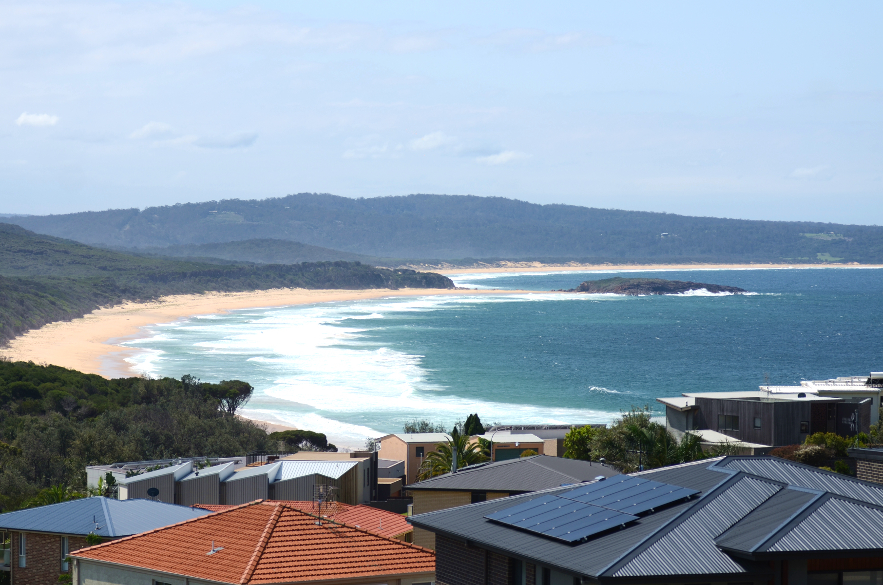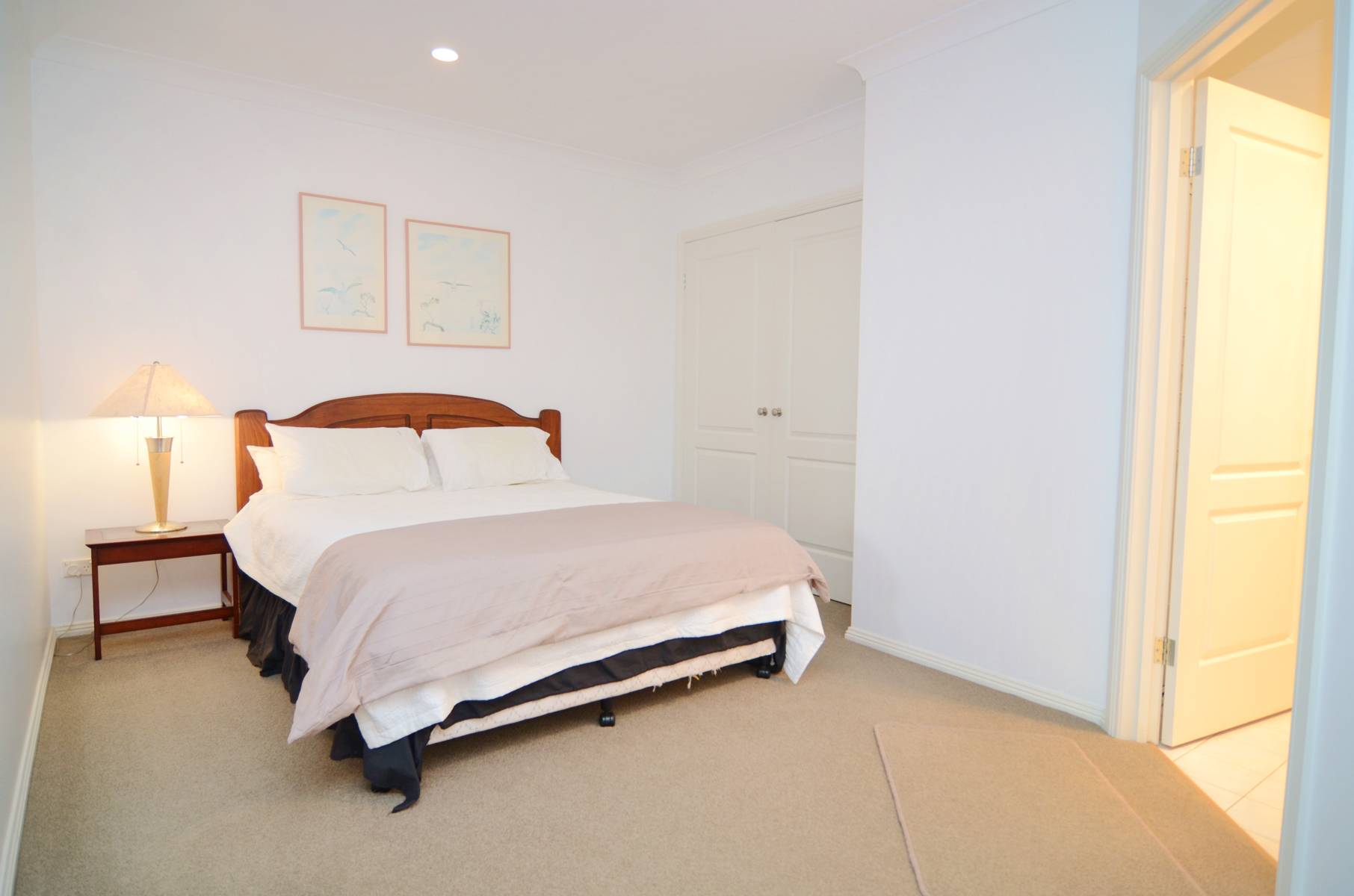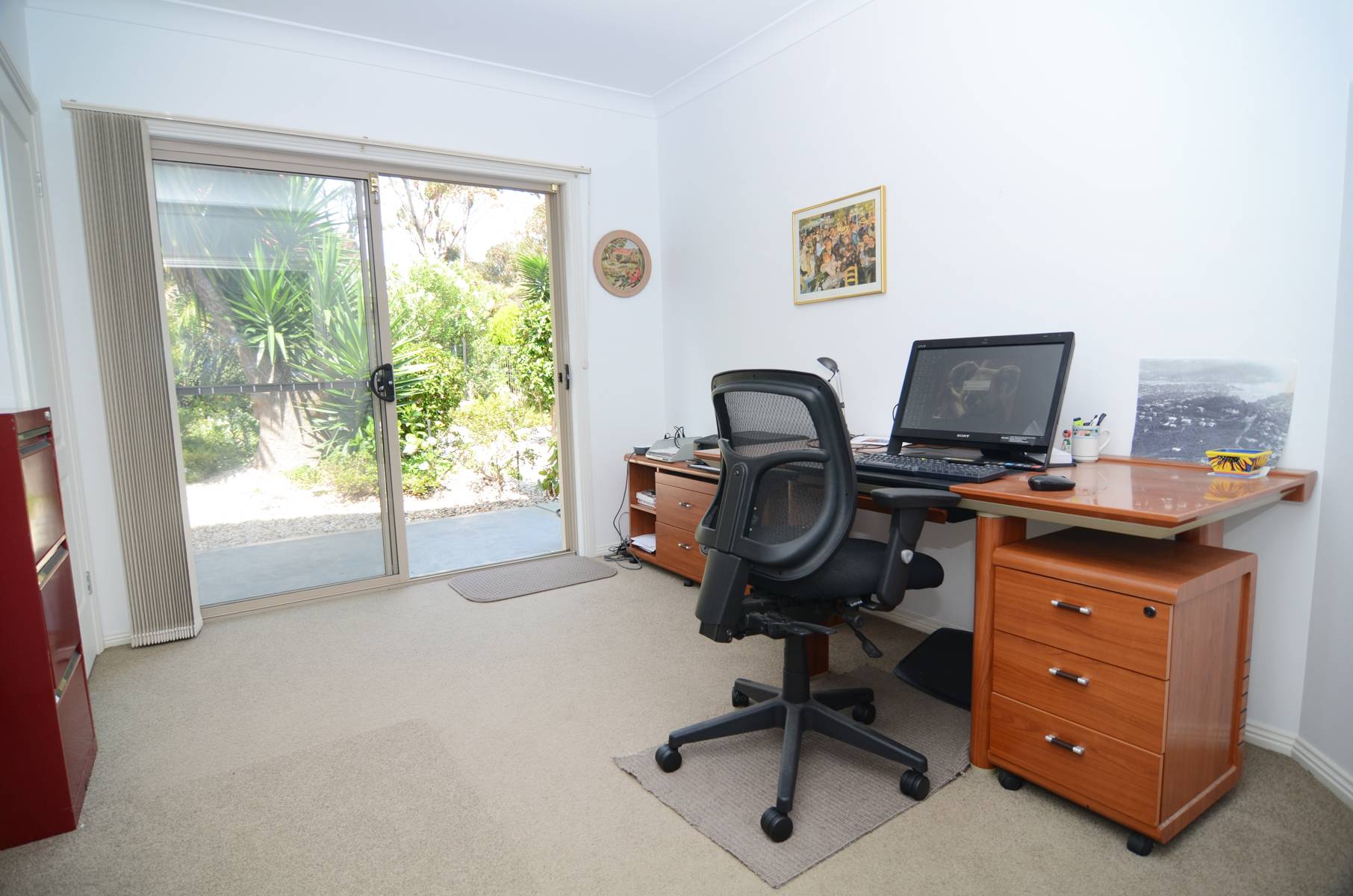 The living areas are separated by a central, modern kitchen overlooking Tura Beach and Bournda National Park with muted stone bench tops, quality appliances and a huge amount of cupboard storage.