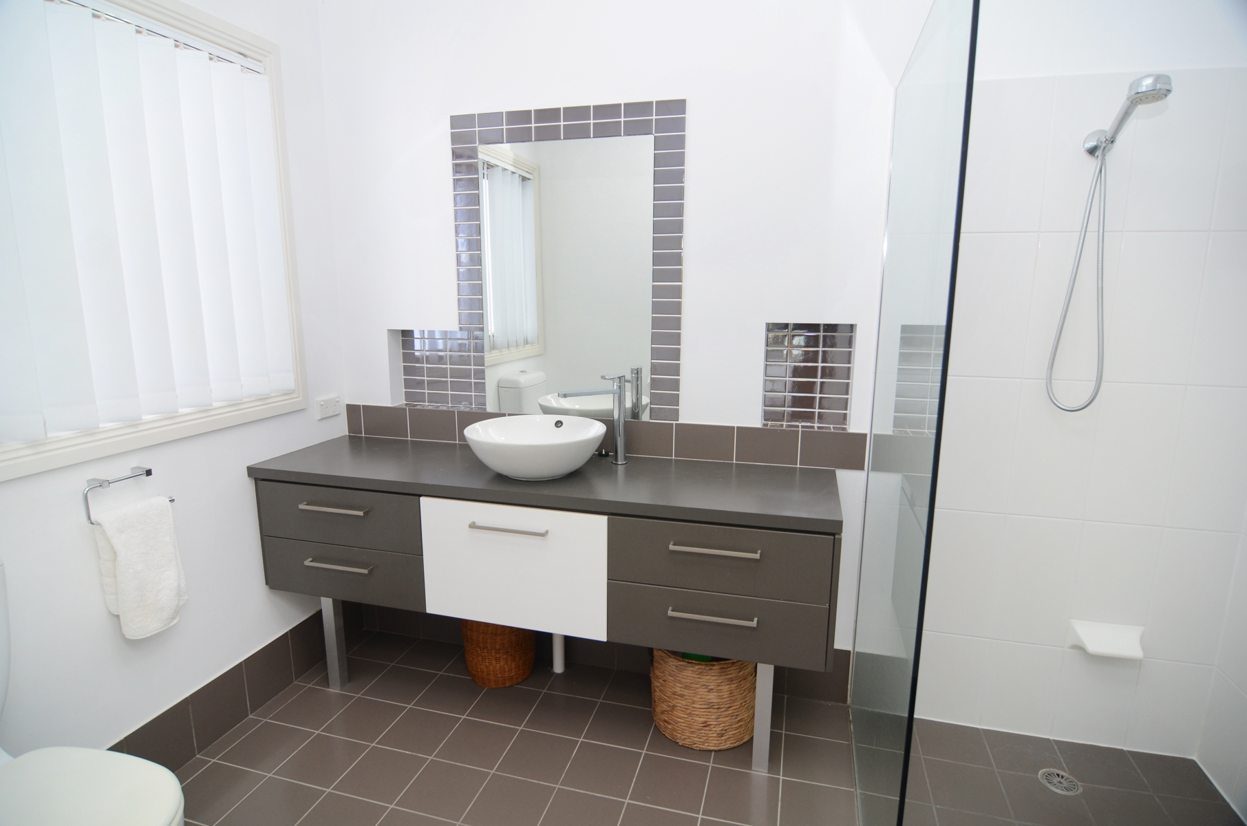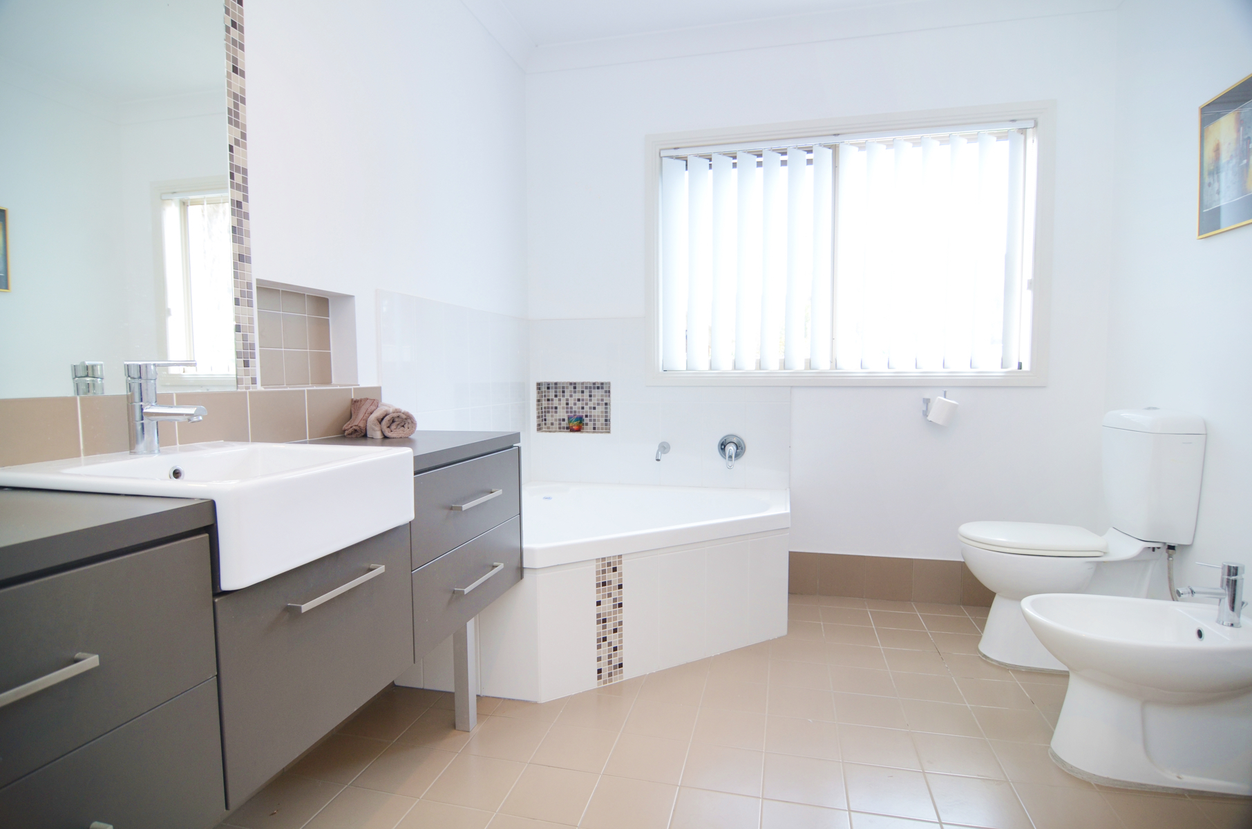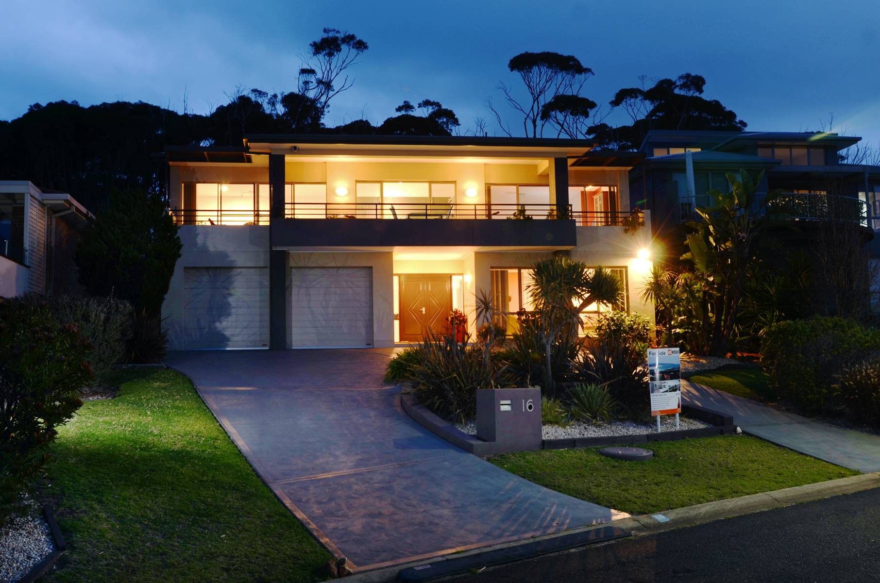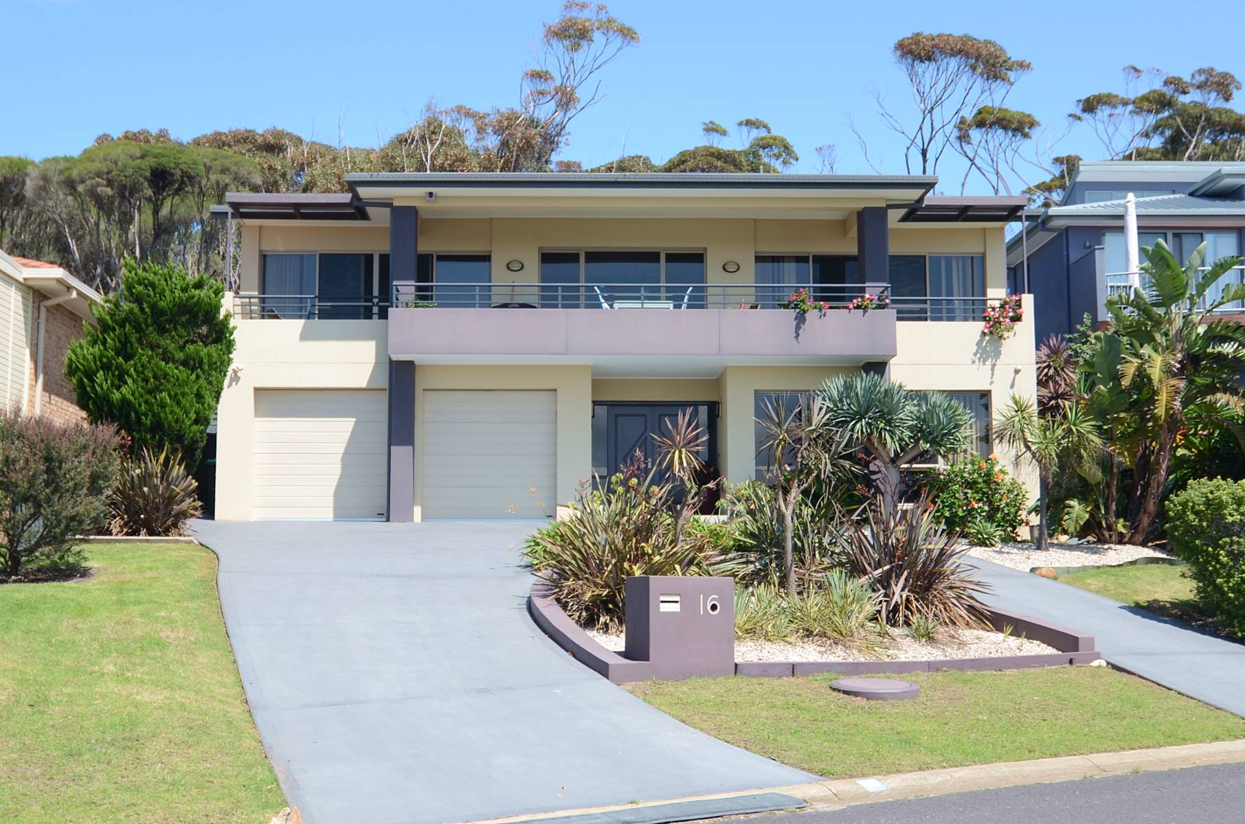 The living areas are separated by a central, modern kitchen overlooking Tura Beach and Bournda National Park with muted stone bench tops, quality appliances and a huge amount of cupboard storage.