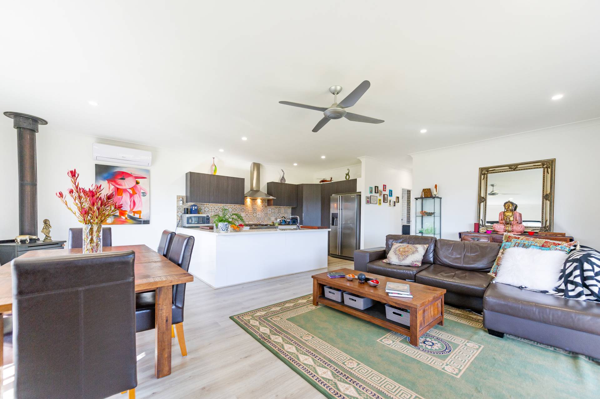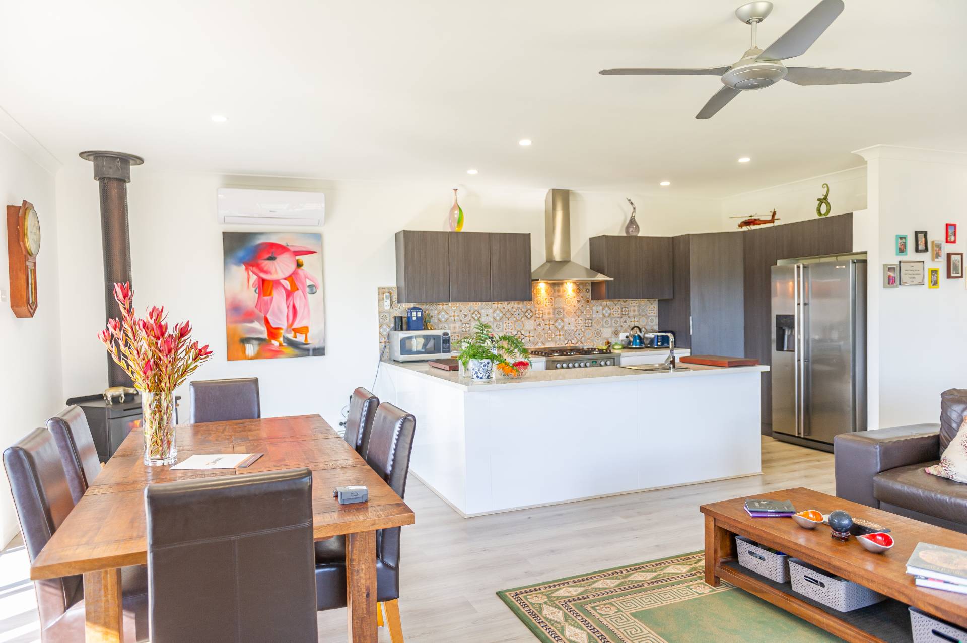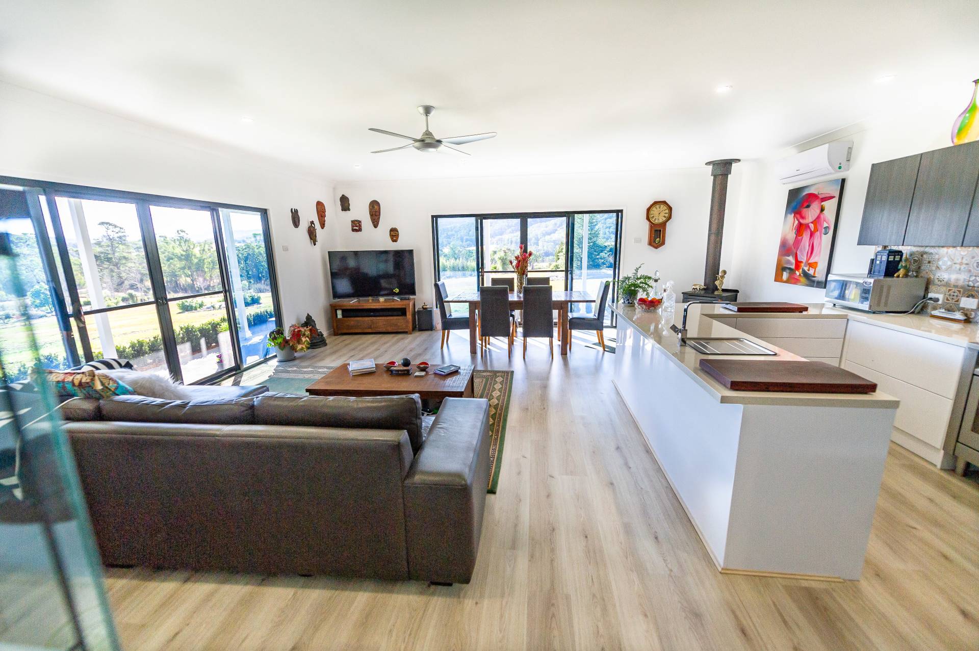 The new steel framed home has been designed for comfort in mind with a spacious open plan comprising the large well appointed kitchen with stainless appliances including a freestanding gas top oven, dishwasher and stone bench tops. A wood fire place, reverse cycle and fully insulated external and internal walls guarantees your control over warmth and sound within your home. A large and luxurious bathroom features a freestanding, deep bath, open shower and picture window to really appreciate your surroundings with a soak. A 104,000 litre water tank, a licensed bore and huge dam ensures you won't run dry. There is a 6m x 6m shed, green house, connection to the NBN and yet there is more!