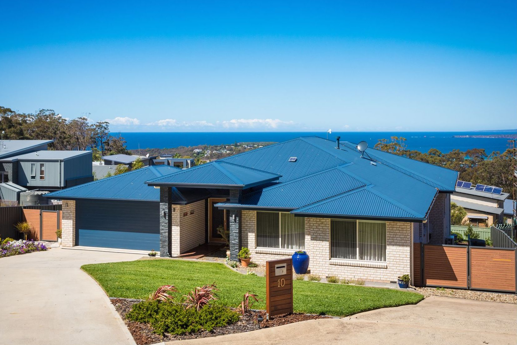 Quality with a multitude of features. Formal entrance, 4 bedrooms all with robes, 2 bathrooms and study/office. Beautiful kitchen with an Island Stone bench and a full butlers pantry, second sink, dish washer, stainless appliances and separate food larder. There is 2 spacious living areas with views of the ocean, Merimbula lights at night and the mountains. The master bedroom is huge, has access to the balcony, water views, a 'walk-in' dressing room and en-suite. Downstairs is a self contained area that includes a powder room. The property is located in a quiet cul de sac in the popular Mirador estate surrounded by quality homes and near reserve.