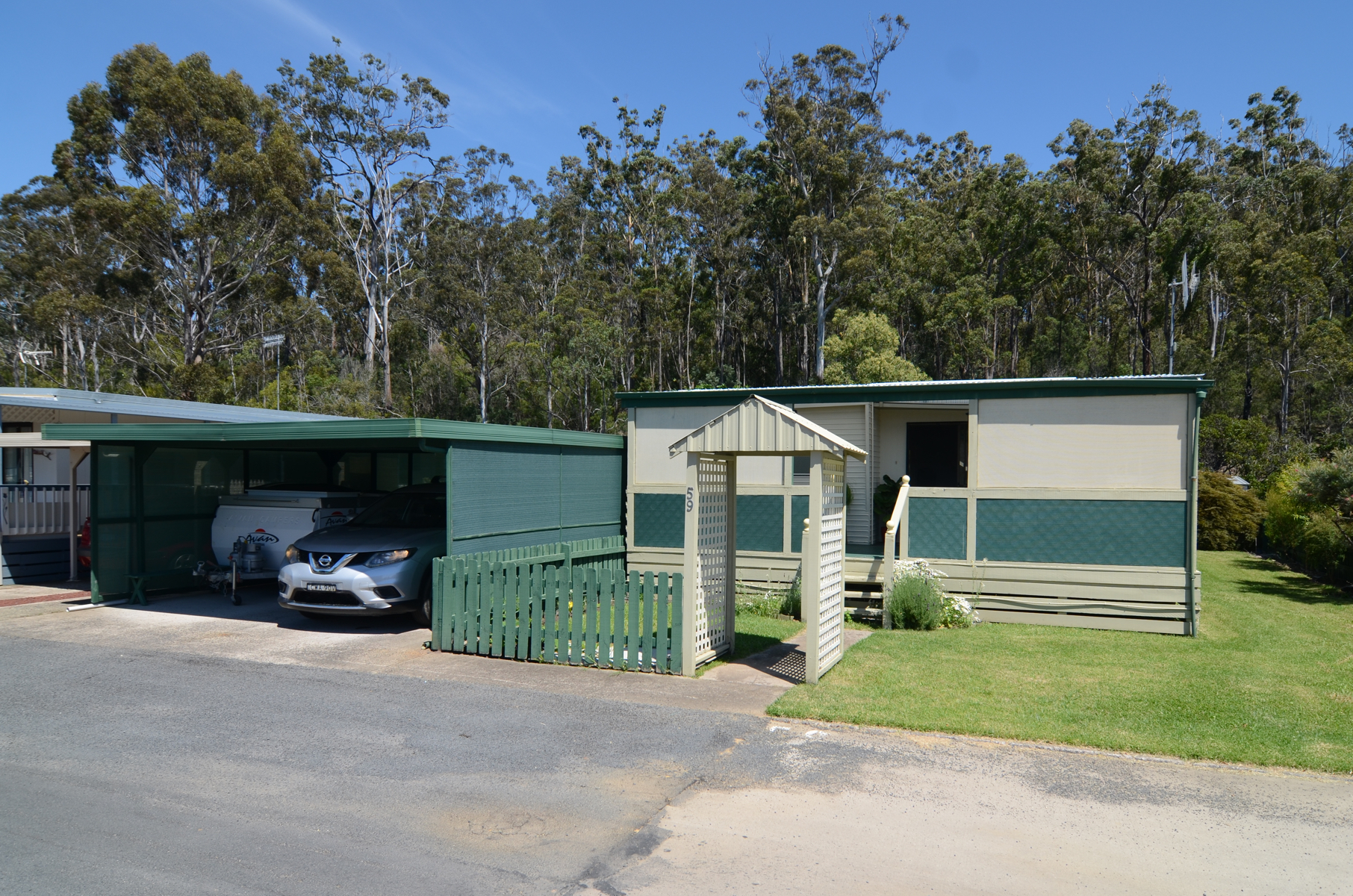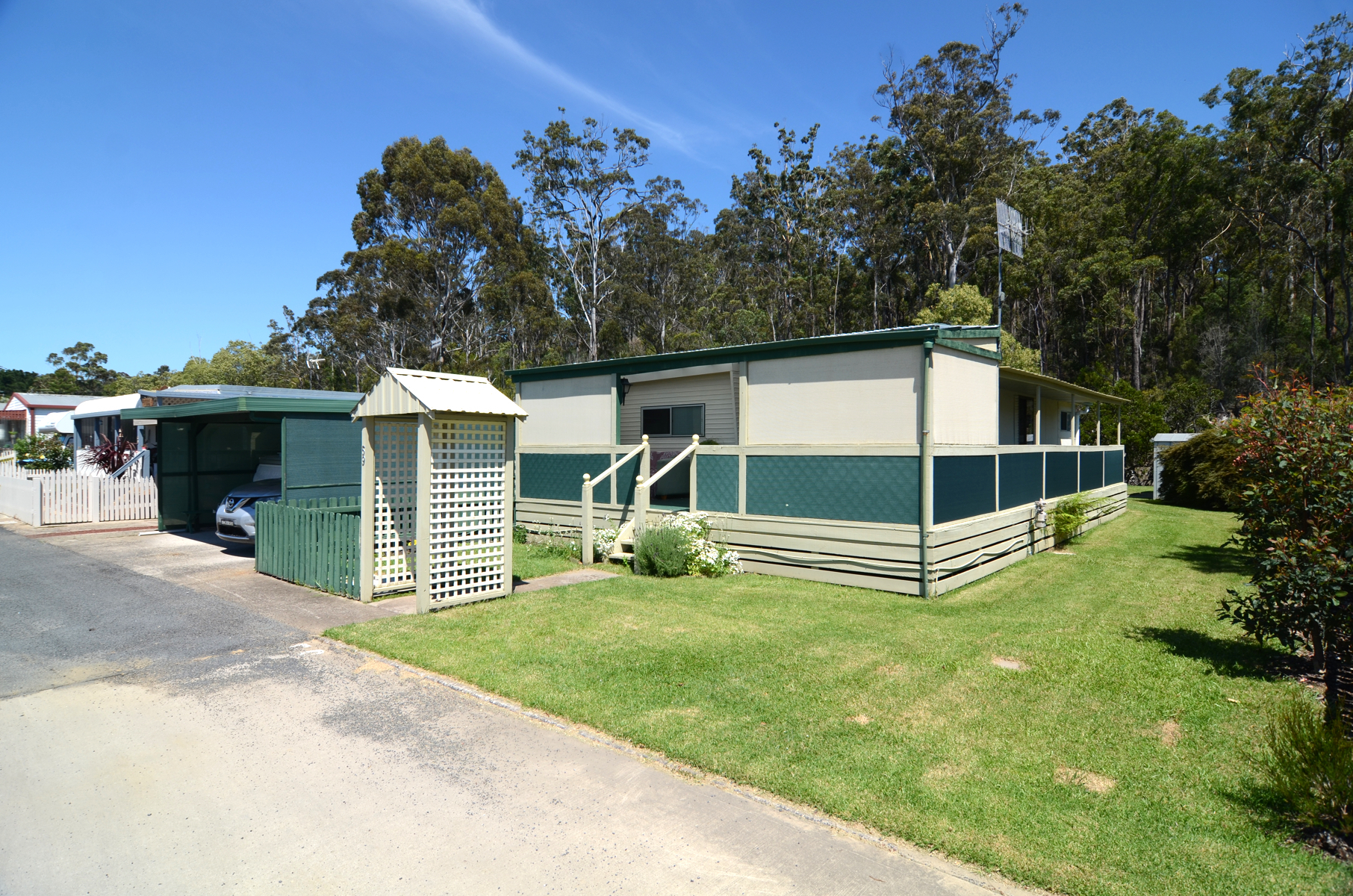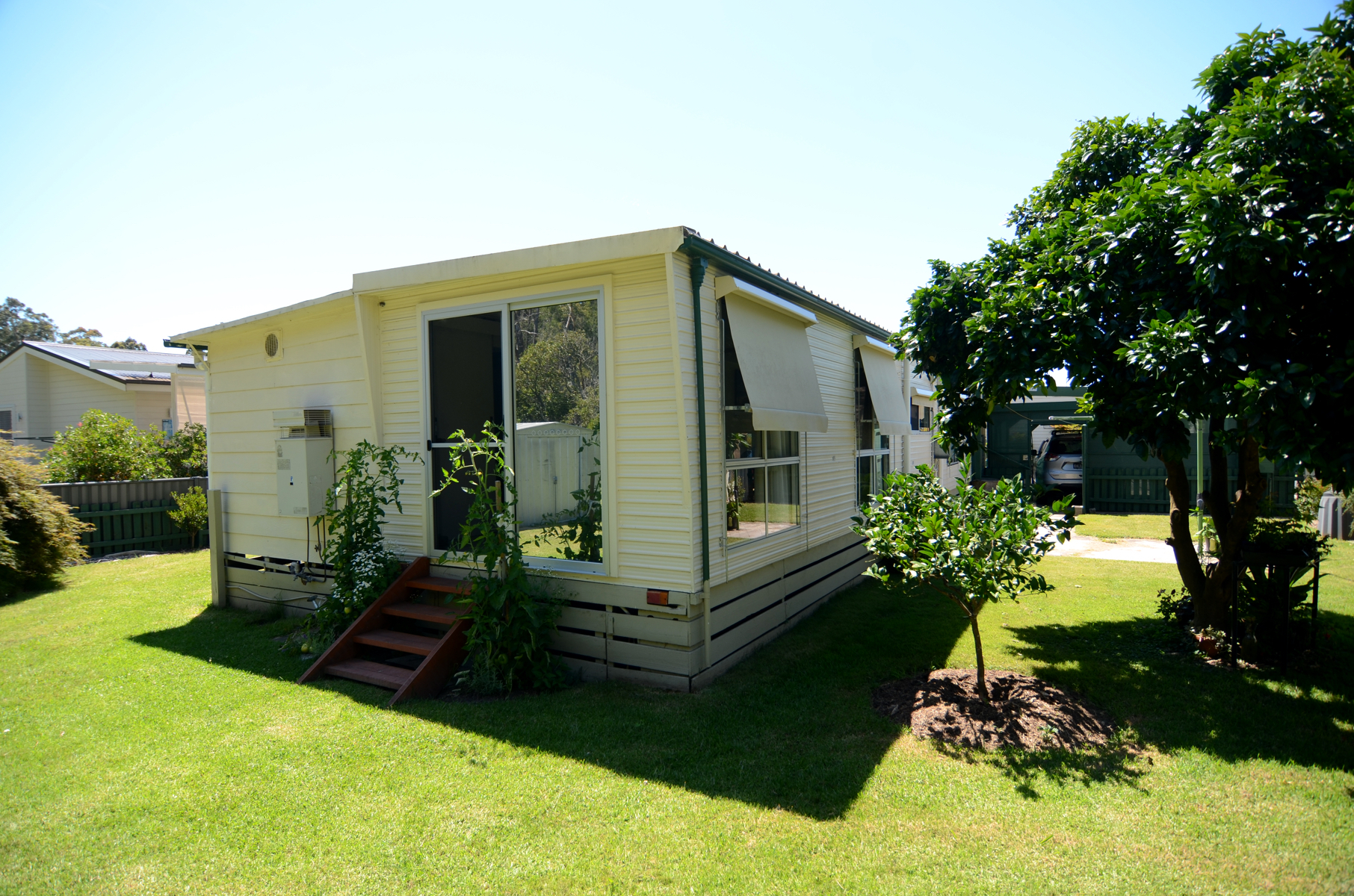 Villa 59 is set on one of the very few double blocks in the park.  Picture luscious green lawns, citrus trees, undercover BBQ area, two powered lock up sheds with the added benefit of backing on to a tidal river for extra tranquility and sense of space.