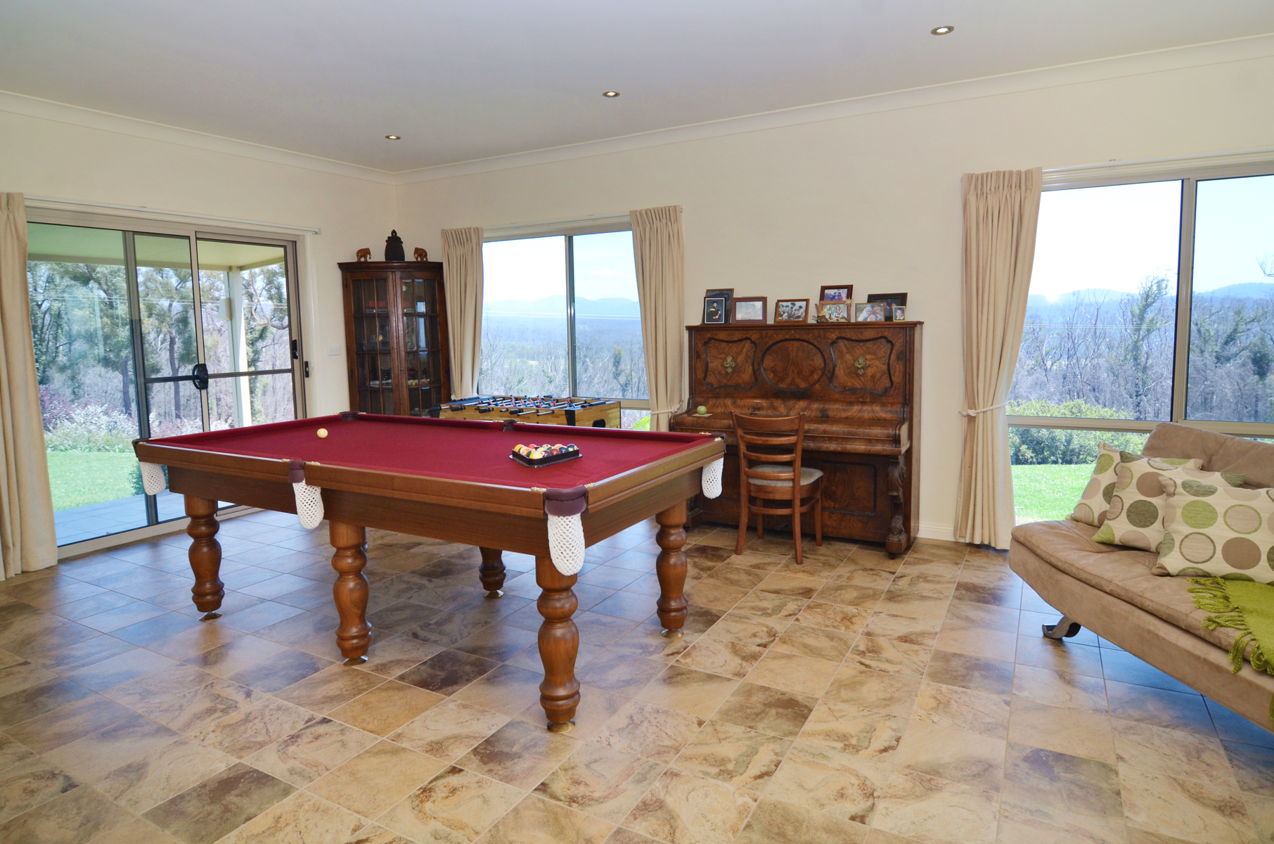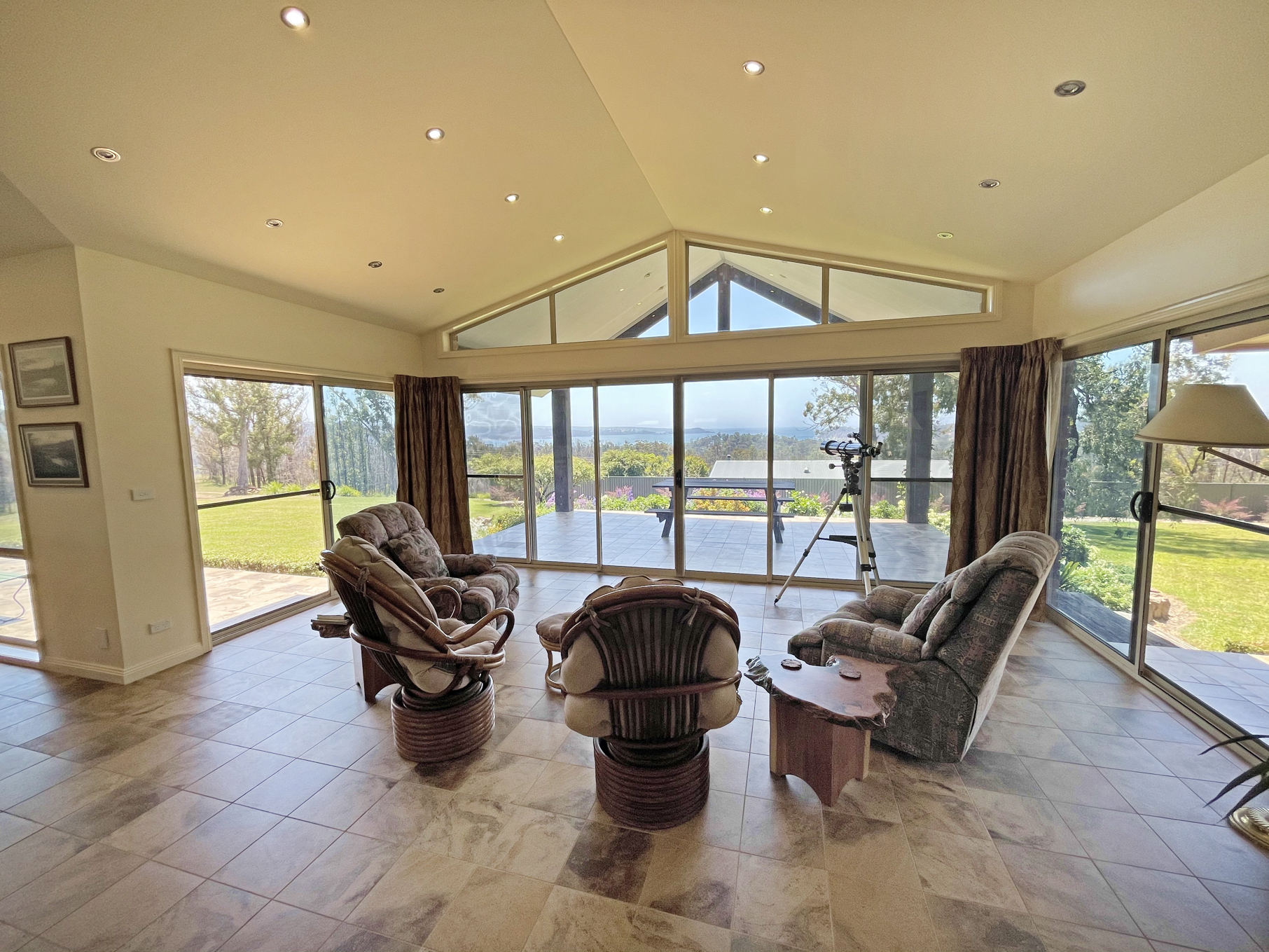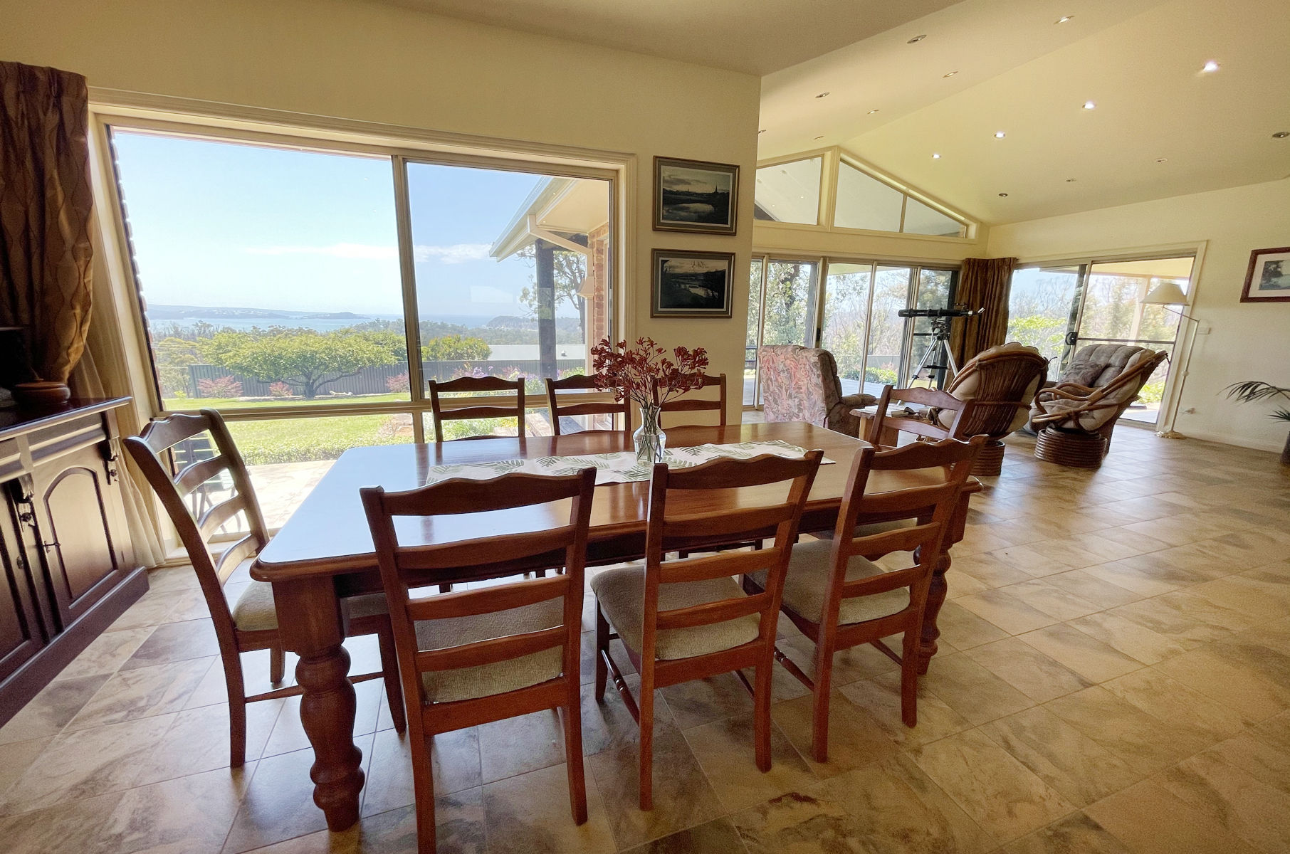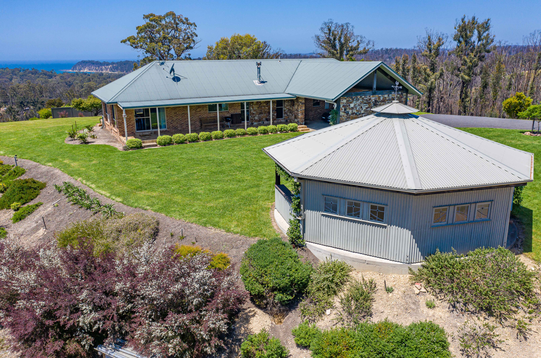 The main residence is carefully designed to maximize the beautiful views and thoughtfully built to accommodate the changing seasons. Generous front and back paved decks give a homestead feel capturing the warmth of the sun, ocean breezes and views all round with open plan living and high ceilings. The living area frames the ocean perfectly through “Comfort Plus” windows providing insulation plus two reverse cycle air conditioners and a large ducted wood heater ensure perfect temperatures all year round. The huge kitchen features granite bench tops and all-Miele appliances including twin ovens, range hood, 80cm induction cooktop and integrated dishwasher. The breakfast bar and ample storage will be a chef’s delight. The living, dining and kitchen areas flow through to an extra large family room, currently a pool room and office but could easily be converted to a 4th bedroom and still have a separate office.