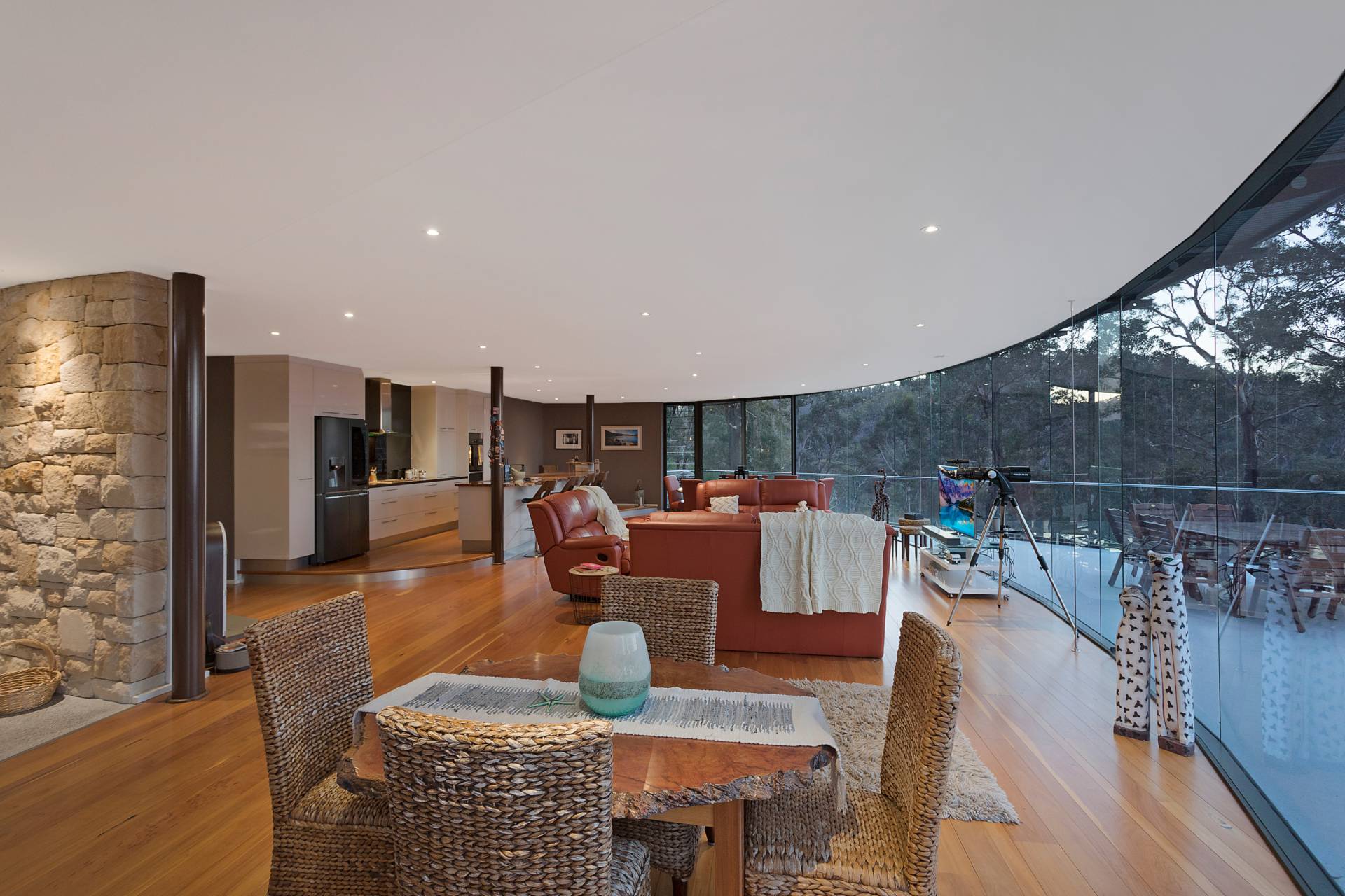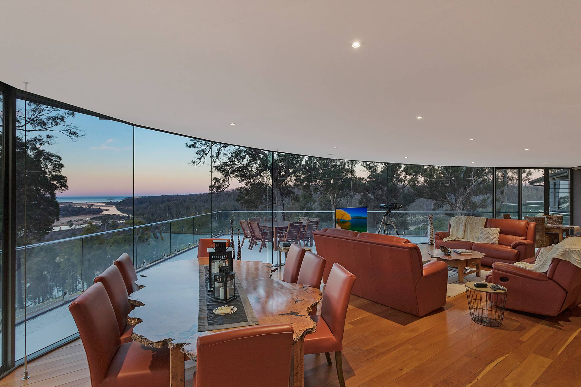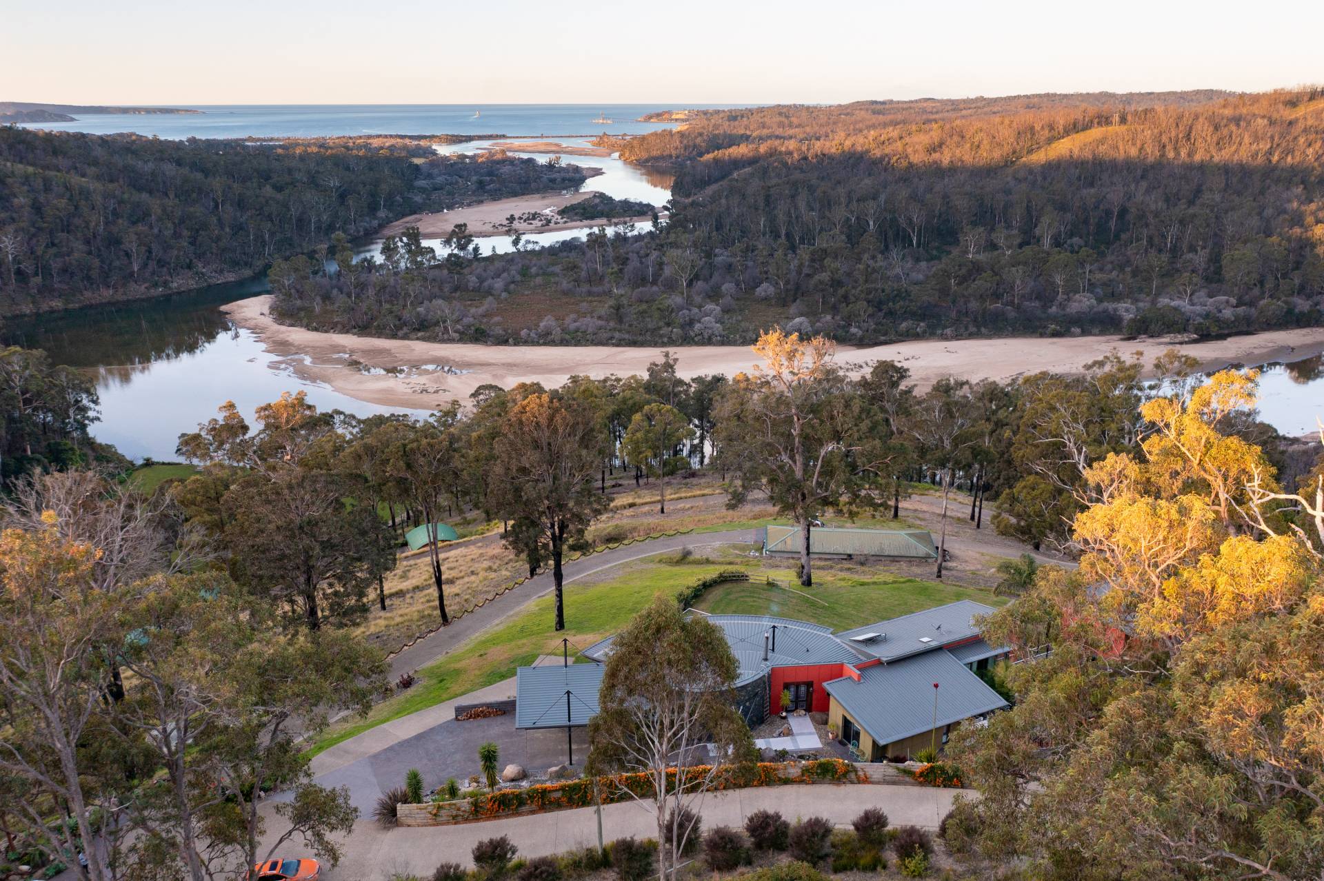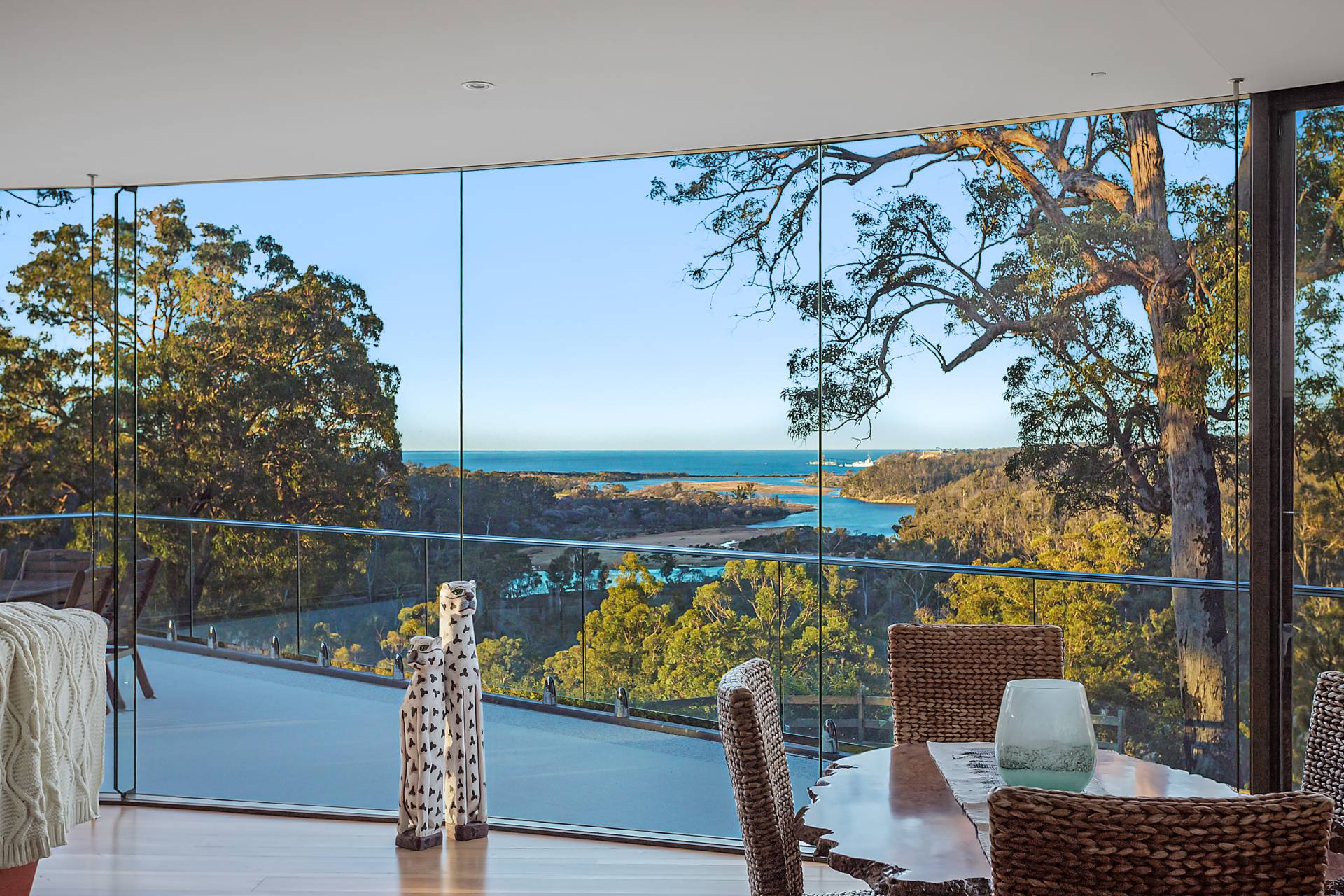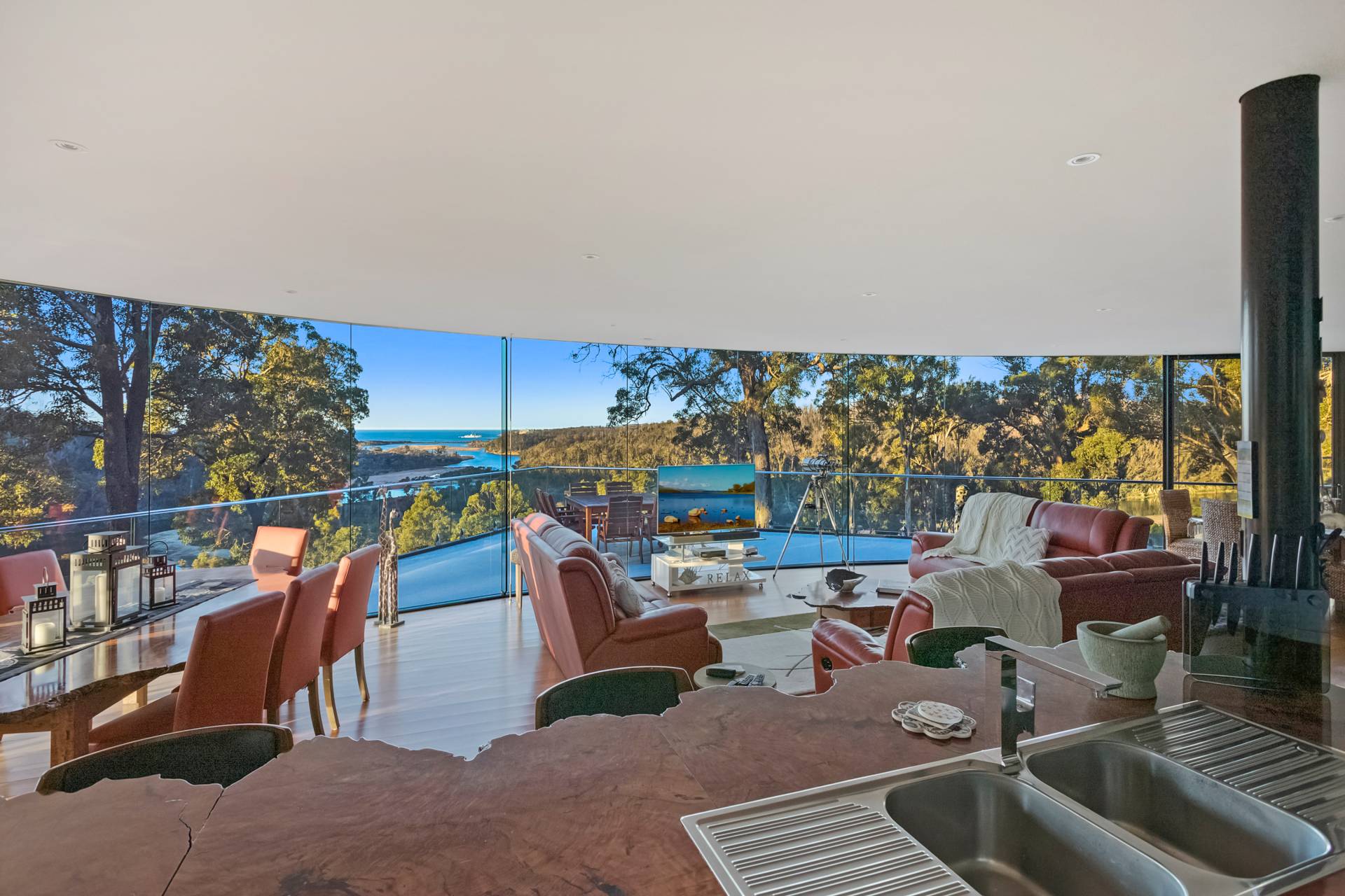 You quickly realise that you’re somewhere special as you approach this home with the stone work, landscaping and established gardens leading you to the level entry grand double doors.The use of natural timbers and stone continues inside from the floors to the stunning kitchen with butlers pantry to the wood fire place in the open plan living area that provides jaw dropping views along Towamba River and all the way out to Twofold Bay.
