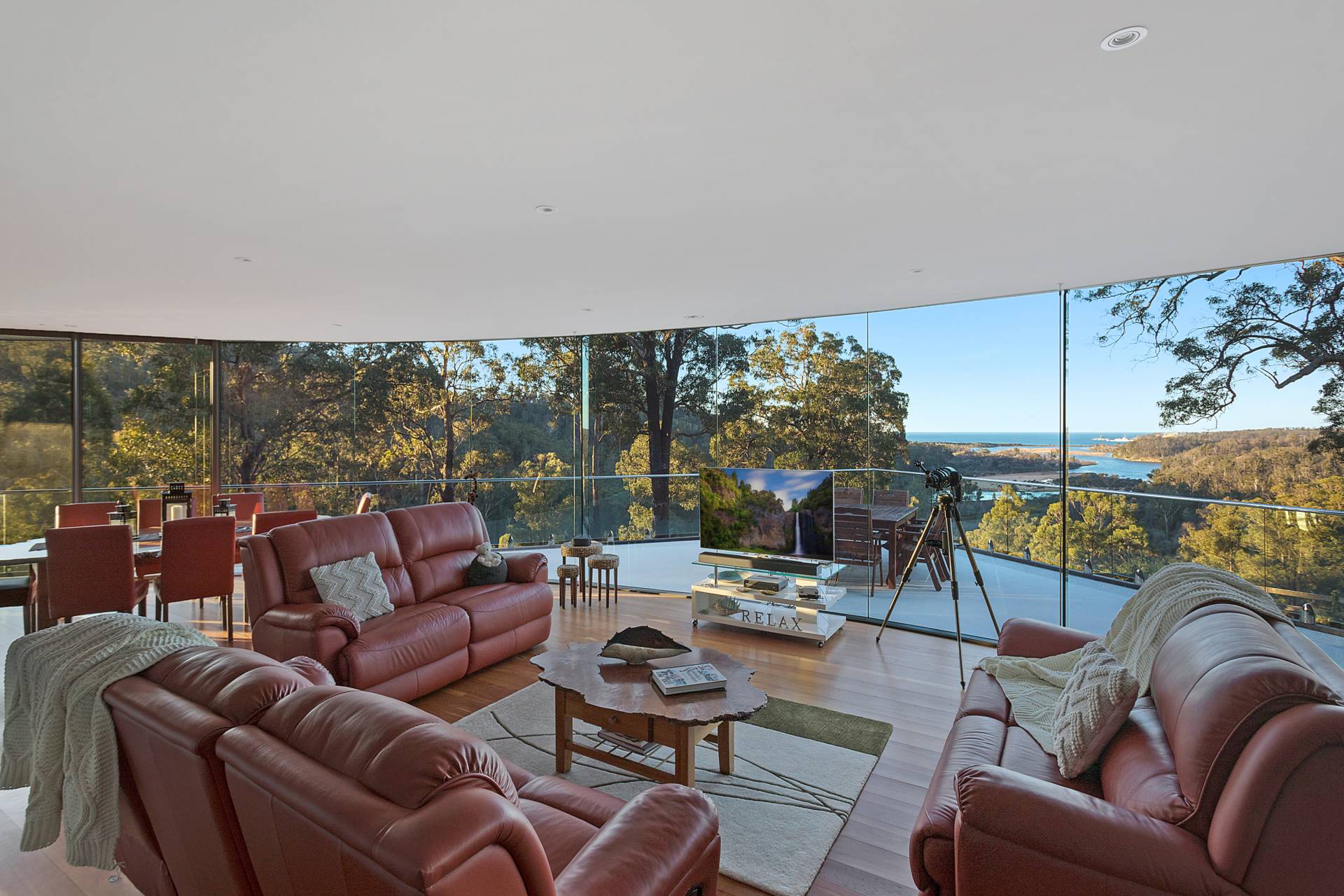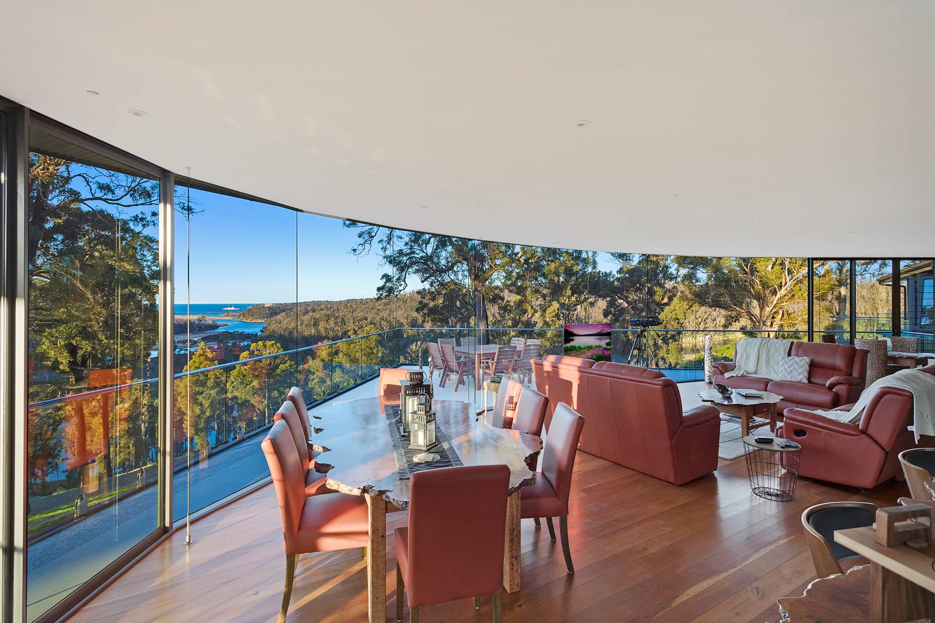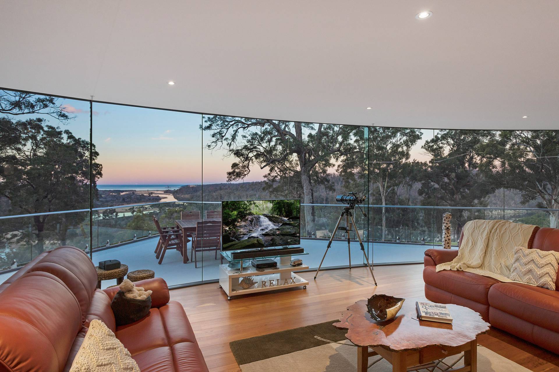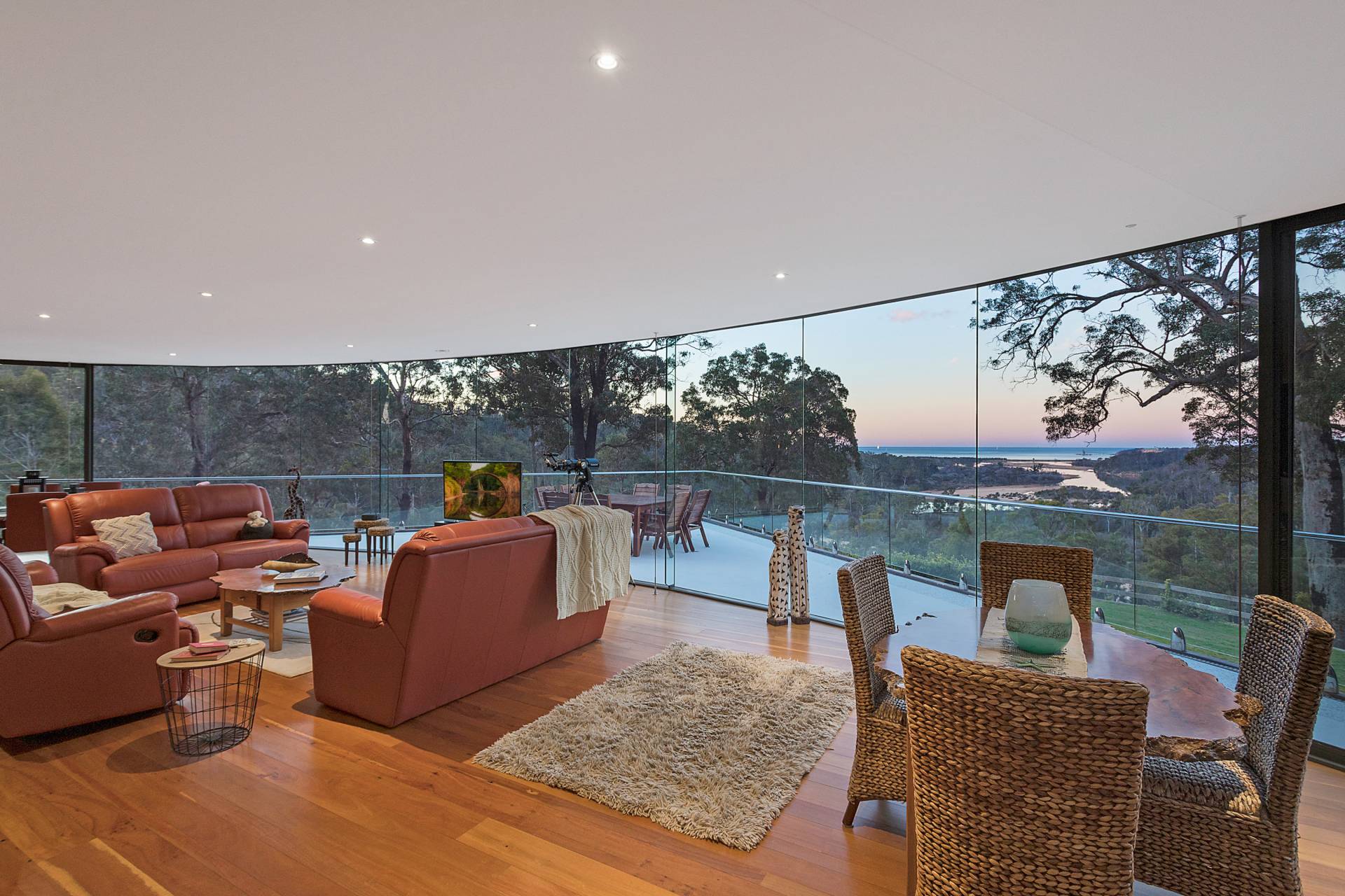 You quickly realise that you’re somewhere special as you approach this home with the stone work, landscaping and established gardens leading you to the level entry grand double doors.The use of natural timbers and stone continues inside from the floors to the stunning kitchen with butlers pantry to the wood fire place in the open plan living area that provides jaw dropping views along Towamba River and all the way out to Twofold Bay.