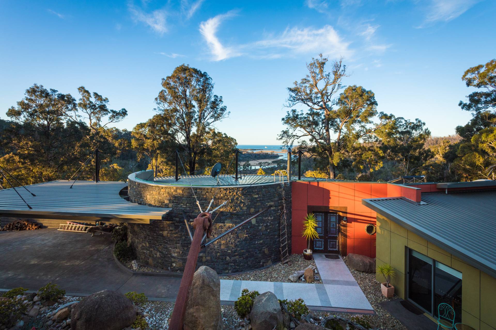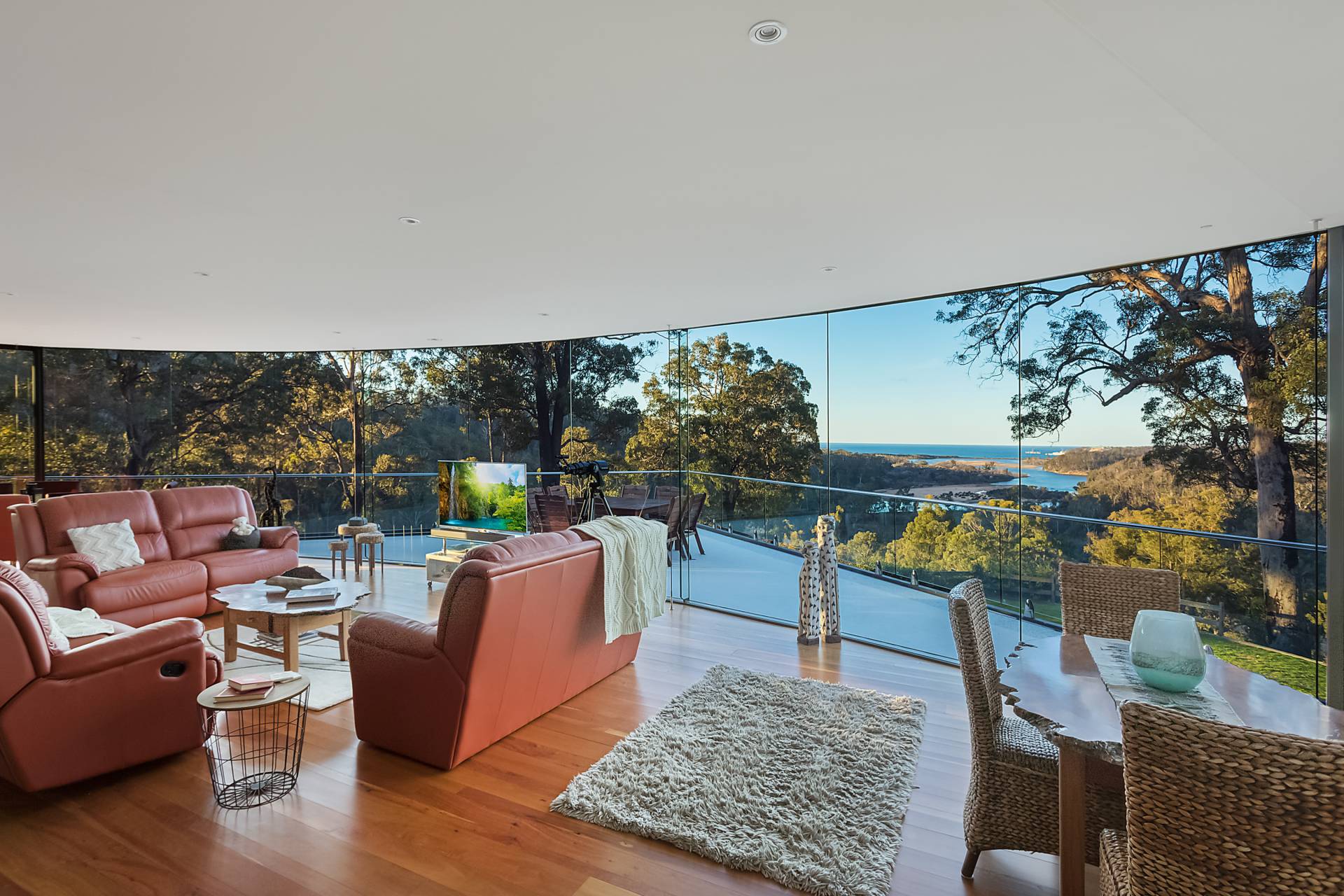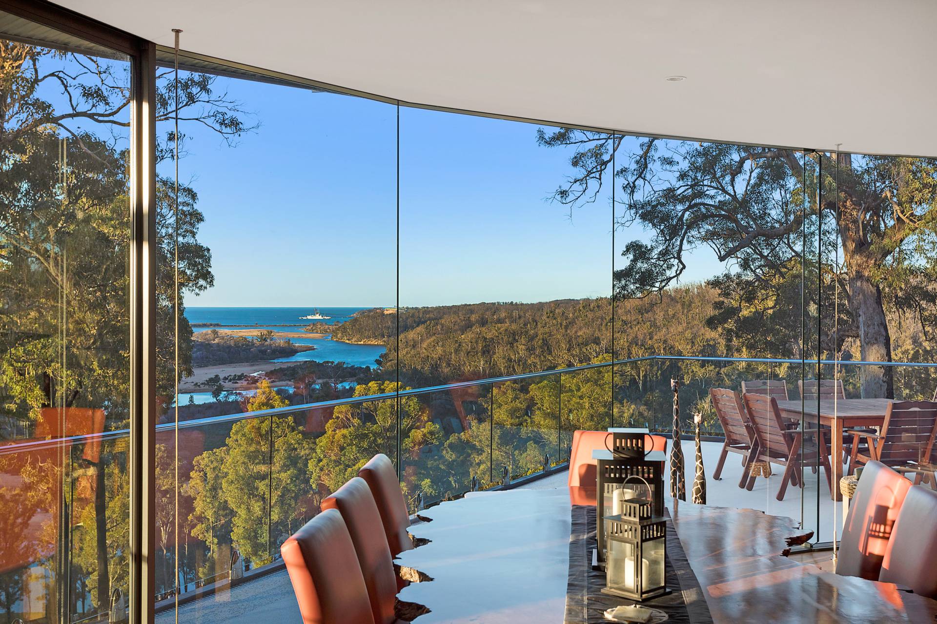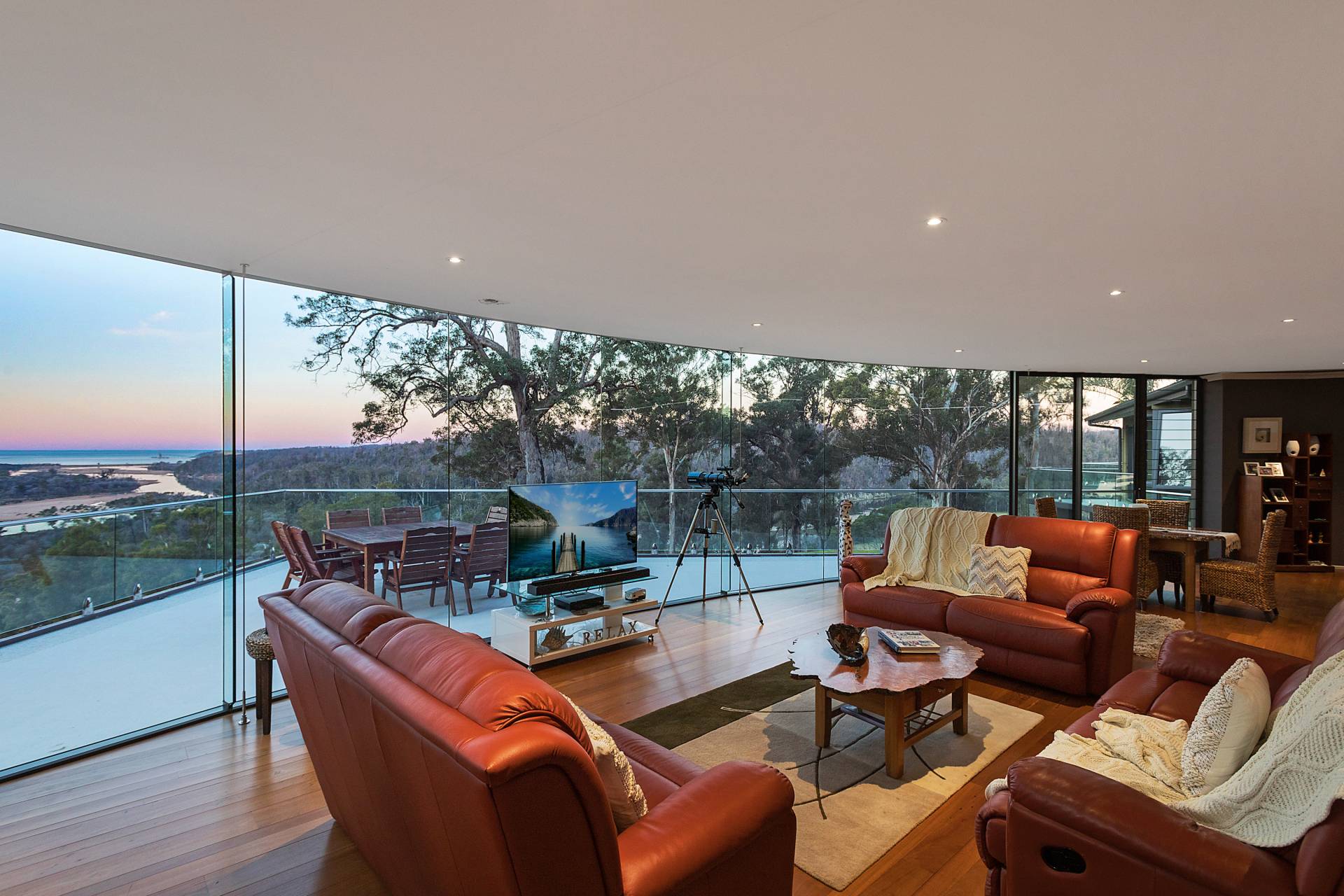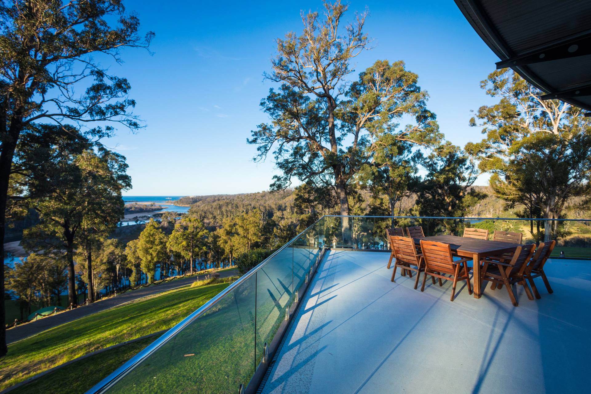 You quickly realise that you’re somewhere special as you approach this home with the stone work, landscaping and established gardens leading you to the level entry grand double doors.The use of natural timbers and stone continues inside from the floors to the stunning kitchen with butlers pantry to the wood fire place in the open plan living area that provides jaw dropping views along Towamba River and all the way out to Twofold Bay.