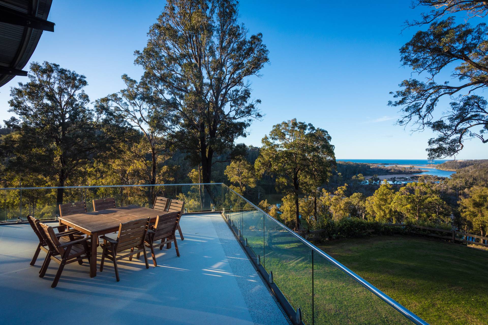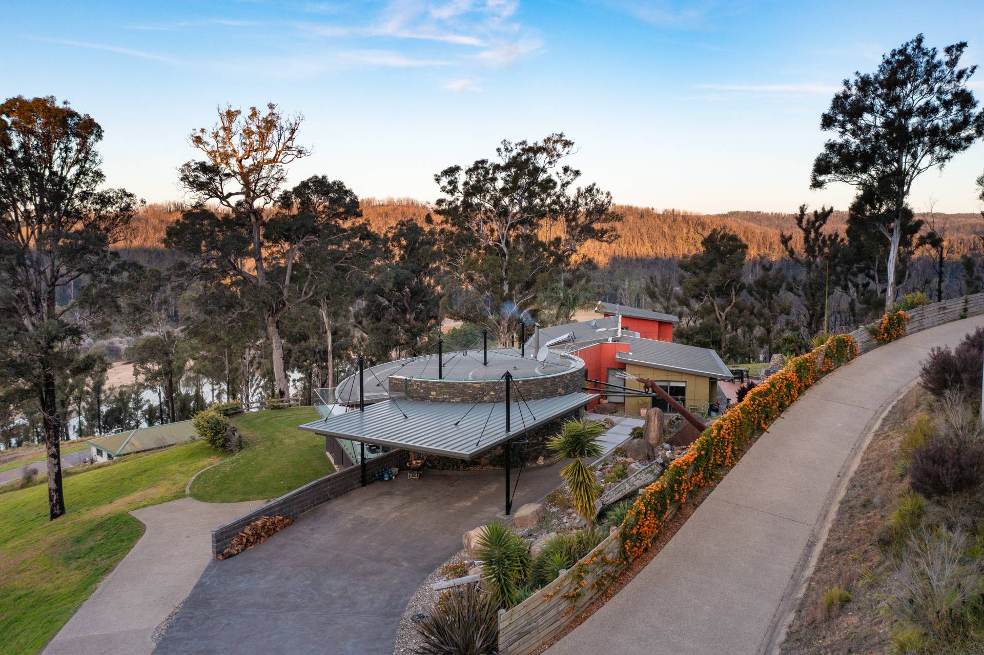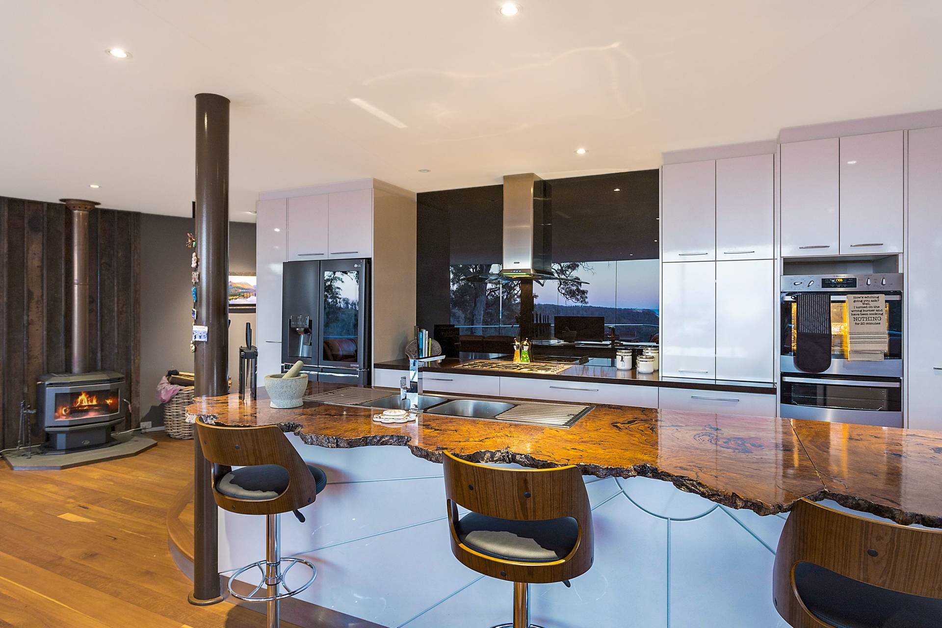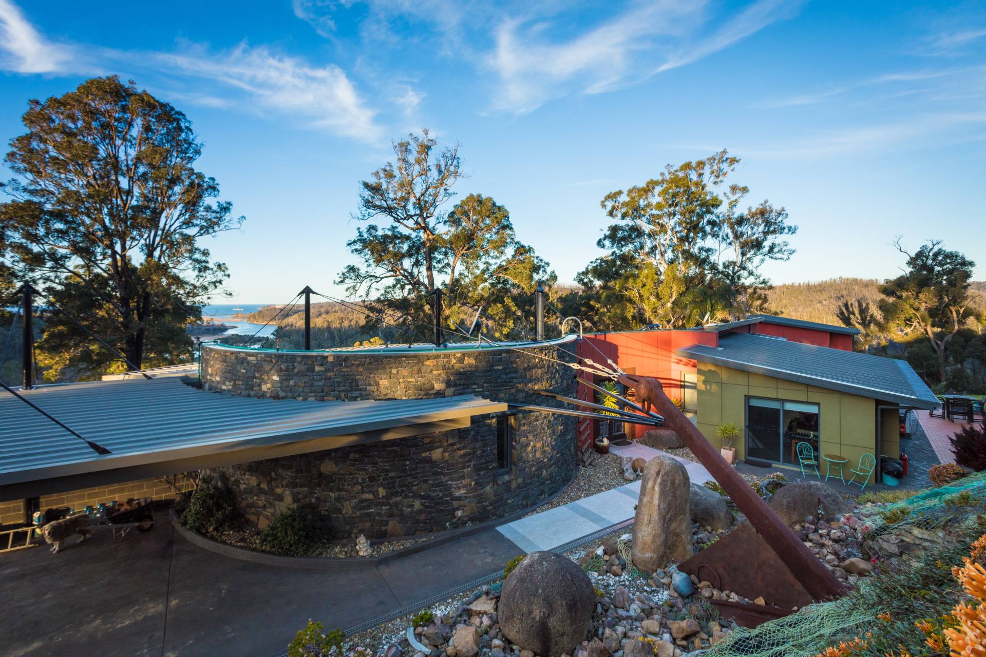 You quickly realise that you’re somewhere special as you approach this home with the stone work, landscaping and established gardens leading you to the level entry grand double doors.The use of natural timbers and stone continues inside from the floors to the stunning kitchen with butlers pantry to the wood fire place in the open plan living area that provides jaw dropping views along Towamba River and all the way out to Twofold Bay.