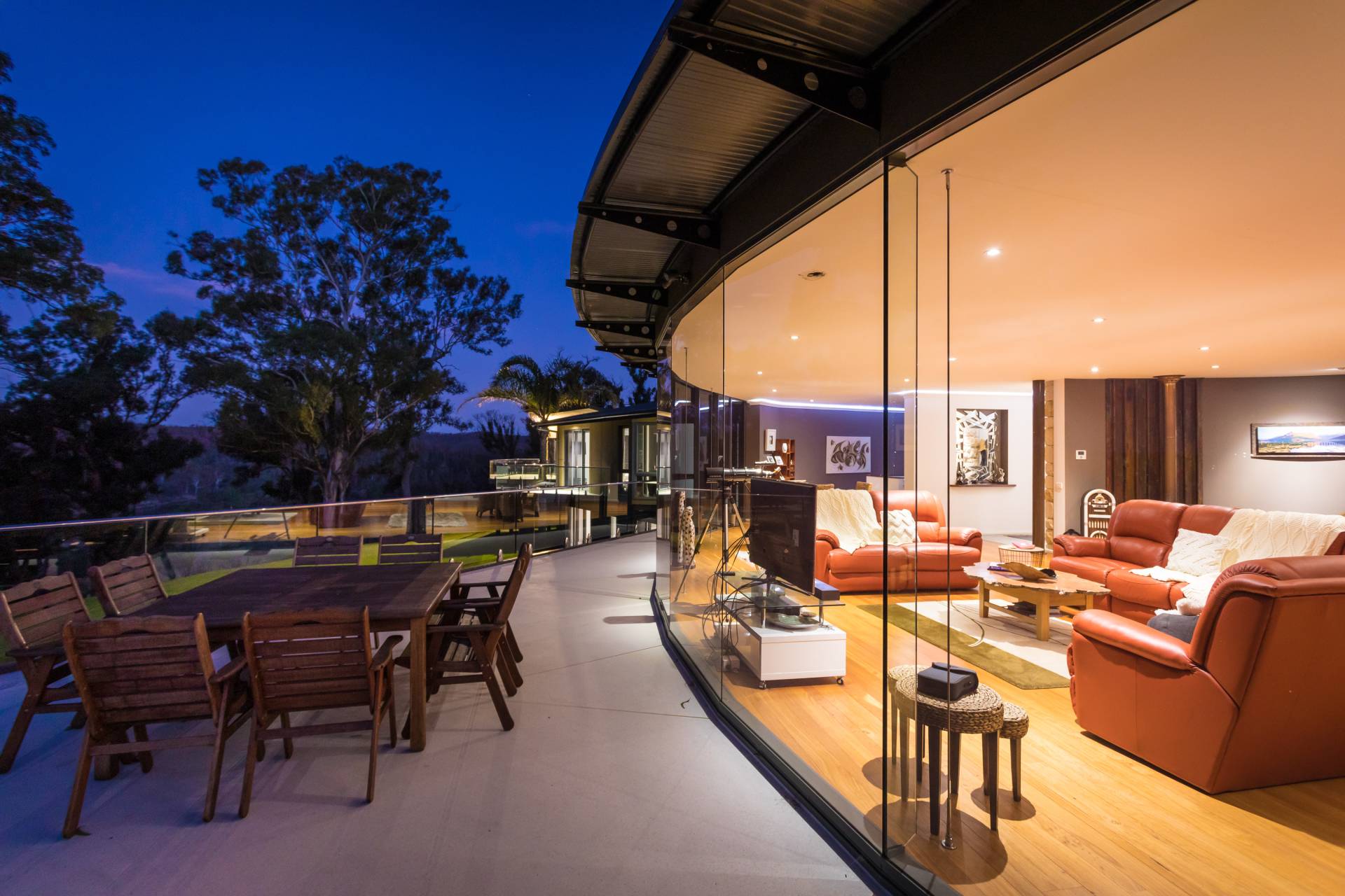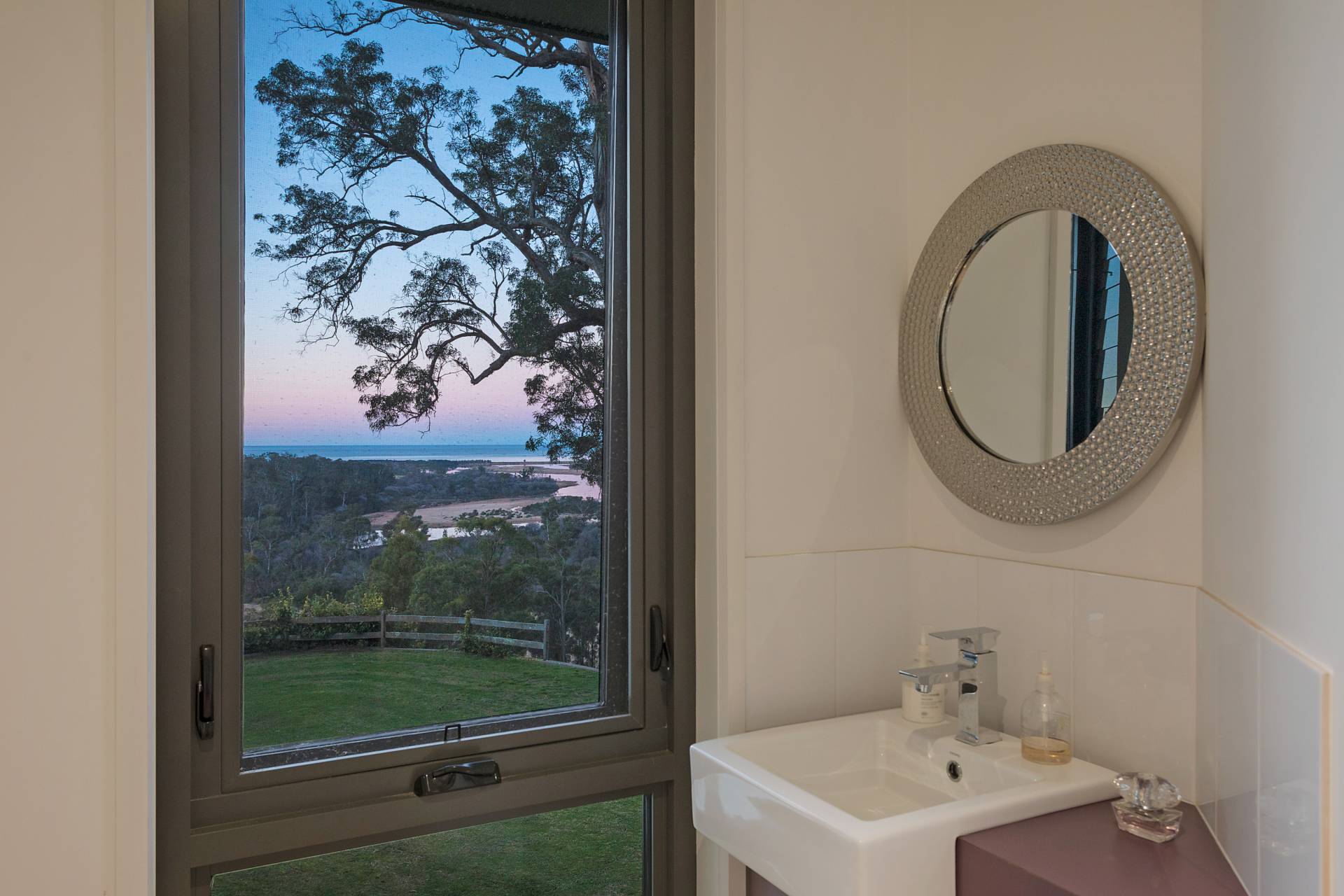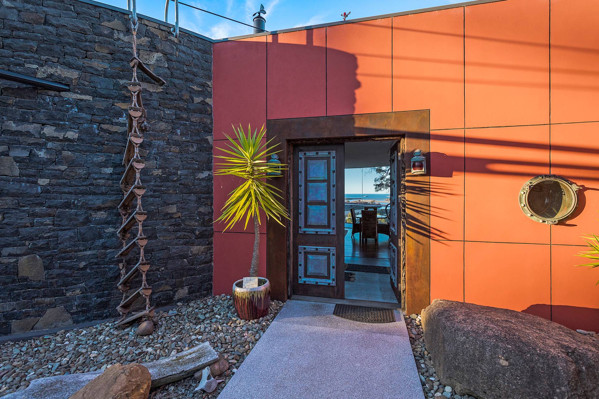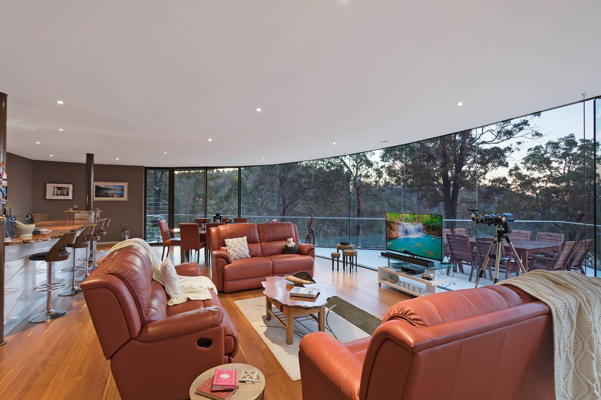 You quickly realise that you’re somewhere special as you approach this home with the stone work, landscaping and established gardens leading you to the level entry grand double doors.The use of natural timbers and stone continues inside from the floors to the stunning kitchen with butlers pantry to the wood fire place in the open plan living area that provides jaw dropping views along Towamba River and all the way out to Twofold Bay.